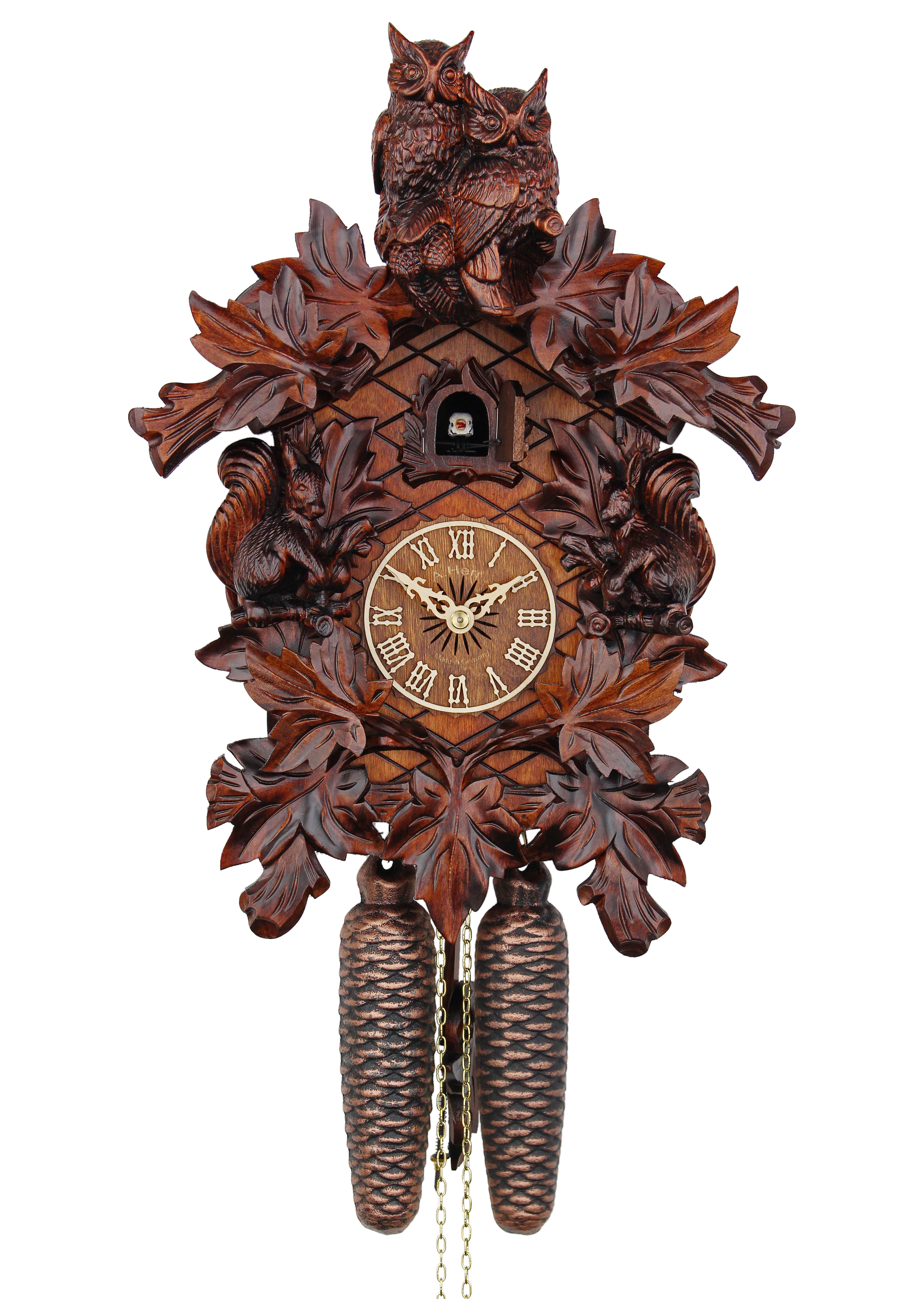 A handshingled Black Forest cuckoo clock decorated with hand-carved squirrels, owls and vine leaves. The cuckoo calls once on the half hour and on the full hour according to the time. The clock is personally signed at the back by the manufacturer Adolf Herr. His signature guarantees the experience of 7 generations of clock-workmanship. This clock comes with a certificate of authenticity (AHC).