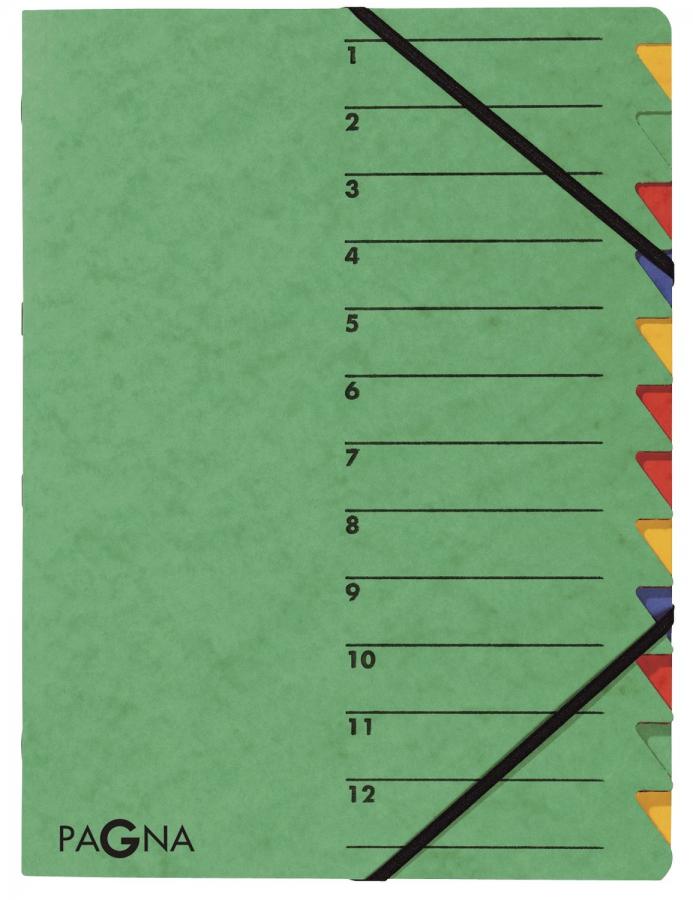 PAGNA Ordnungsmappe ´EASY´, DIN A4, Karton, 12 Fächer, grün mit Organisationsdruck auf der Vorderseite 1 - 12, mit farbigem Griffregister, mit 2 Eckspannergummis, mit farbigem hochwertigem Innenblock Maße: (B)240 x (H)320 mm (24131-03)