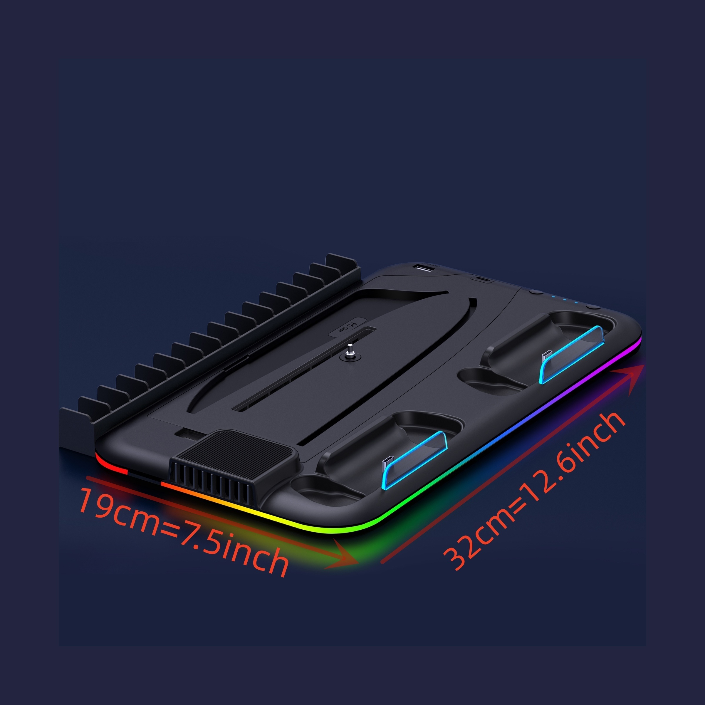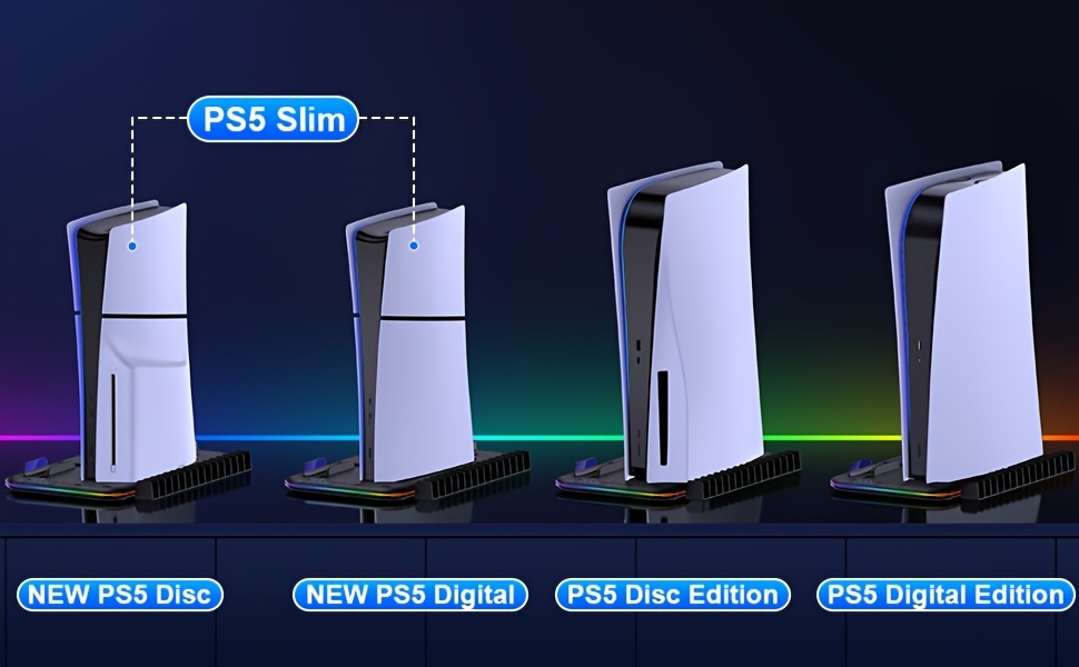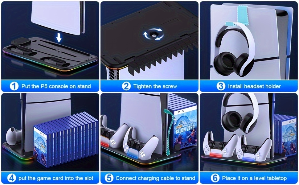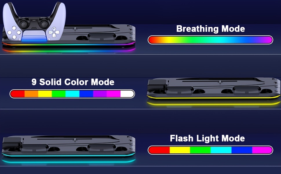 🌀 【THE COOLEST P5 COOLING STAND WITH RGB LIGHT】 The Playstation 5 stand has a circle of cool RGB LED lights, just press LED light switch to adjust 6 different RGB modes at will. This is the COOLEST PS5 vertical stand for you! You can switch the LED color and mode according to different games to build your own exclusive gaming ambiance! The ps5 cooling station with led has a memory function. The last LED mode will be maintained when turned on again. Long press for 3 seconds to turn off the RGB.