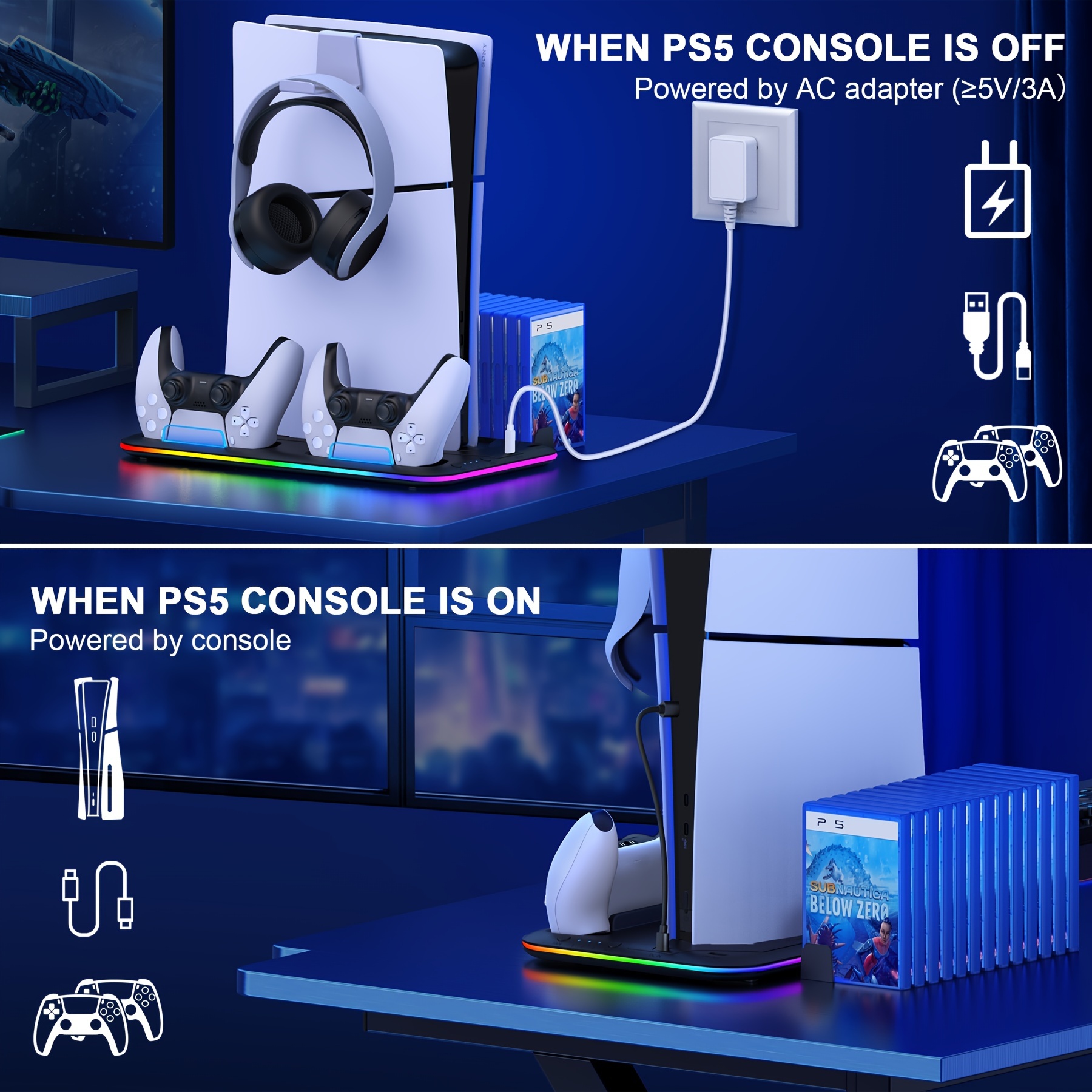 🌀 【3H FAST CHARGING & MULTIPLE POWER SUPPLY METHODS】 Come with 9.06inch C to C Charging Cable, PS5 stand with cooling fan and controller charger can fully charged 2 PS5 Dualsense controllers within 3H simultaneously. LED indicators clearly shows the charging status. Light off: Standby; Red: Charging; Blue: Fully Charged and LED will turn off after 10min. And playstation 5 charging station can be powered by your console or AC adapter(≥5V/3A), provide you more choices of charging methods!