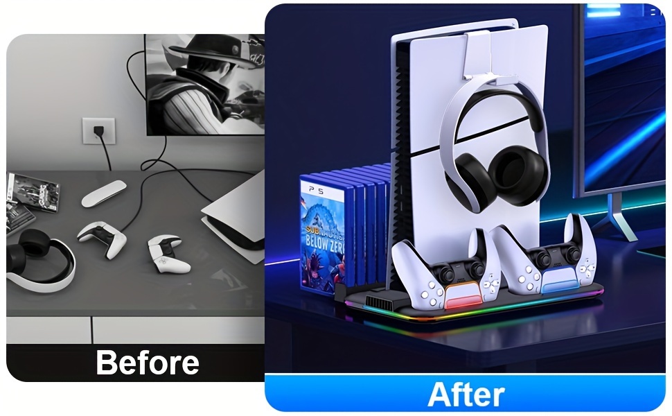 🌀 【AN IDEAL PS5 ACCESSORIES】 PS5 station is perfectly compatible with NEW PS5 Slim/Disc/Digital/Dual-sense controller/Digital/Disc console. PS5 holder has an extra USB port allows to charge devices like mouse, keyboard, headset. With a sleek and tidy design, PS5 accessories bundle saves much space to keep your all ps5 assecories like console, 2 controllers, 15 game discs, headset organized. Your must-have PS5 organizer!
