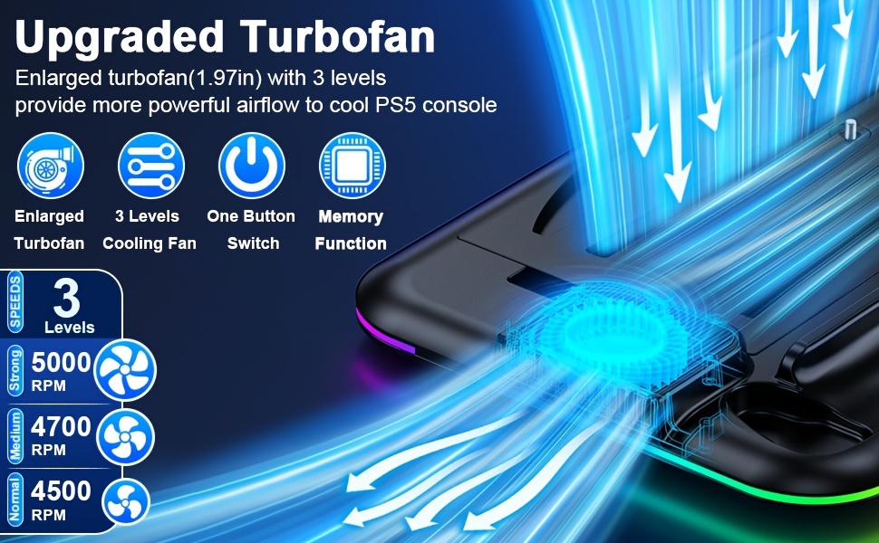 🌀 【PS5 COOLING STATION WITH ENLARGED TURBOFAN】 The PS5 cooling fan has 3 fan speeds: Strong/Medium/Normal. With enlarged 1.97in turbofan, Playstation 5 accessories PS5 fan pulls out hot air from console bottom and efficiently dissipate heat from right side, so PS5 fan cooling fan will keep PS5 console cooling without noise, enhance your gaming experience. No need to worry about console overheating from playing games all day and night! PS5 cooling station will maximize the lifespan of console.