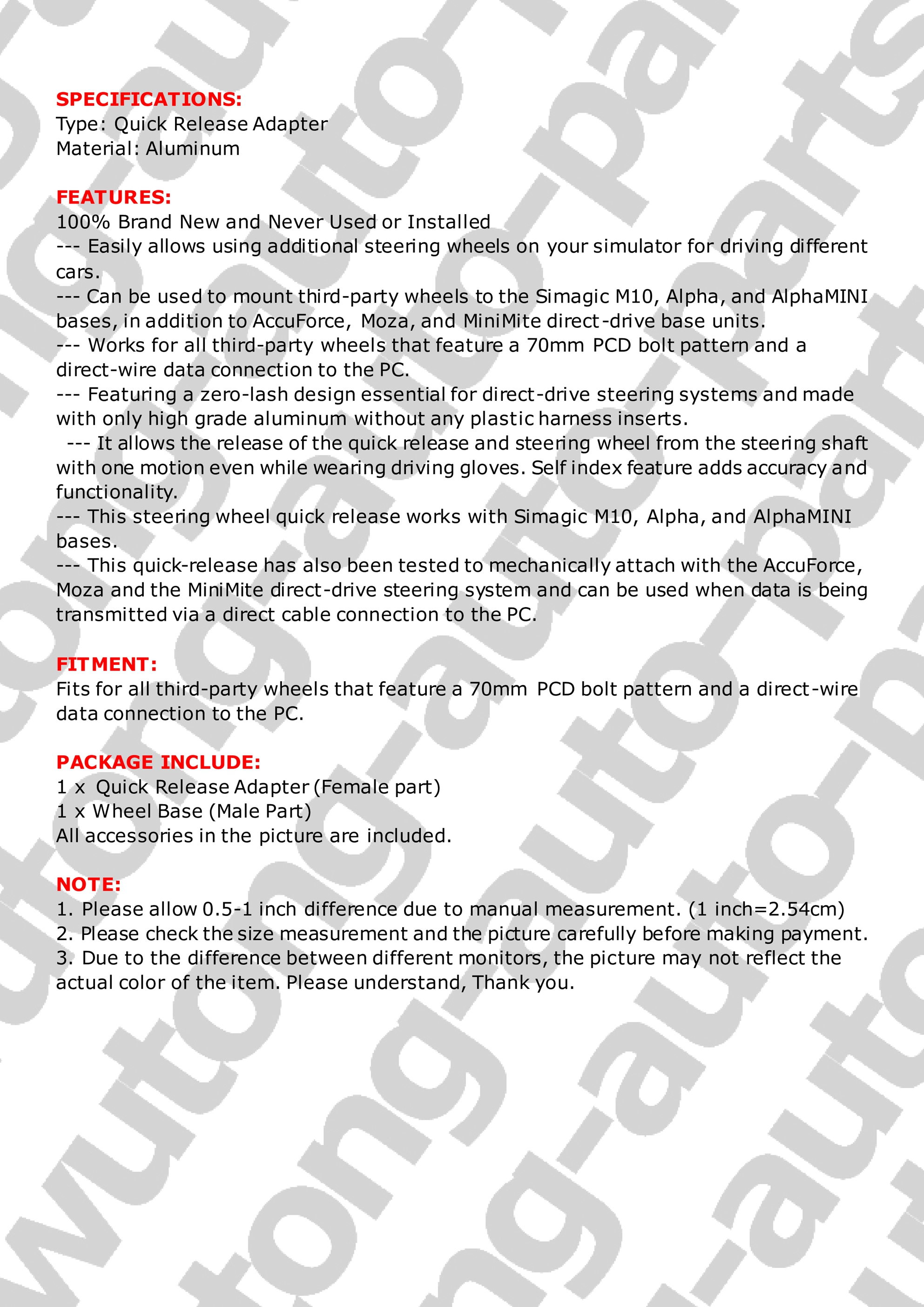 RED 70mm Steering Wheel Quick Release + Wheel Base For Moza/Simagic SIM Racing