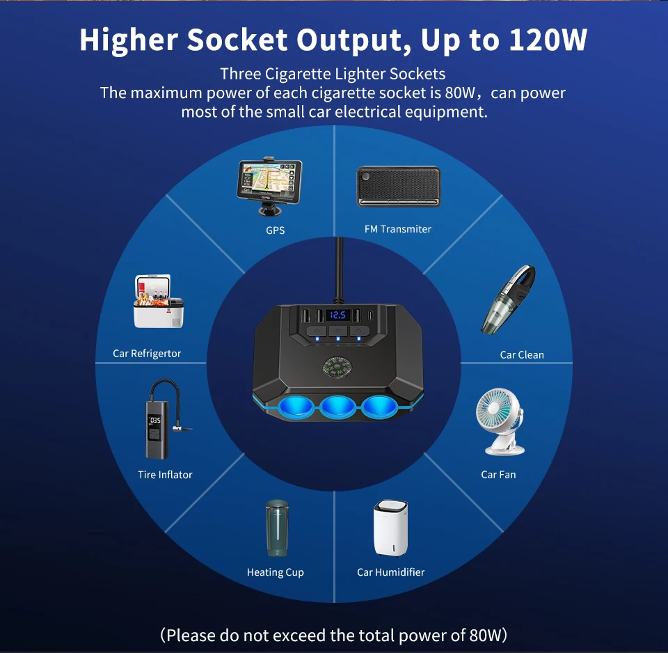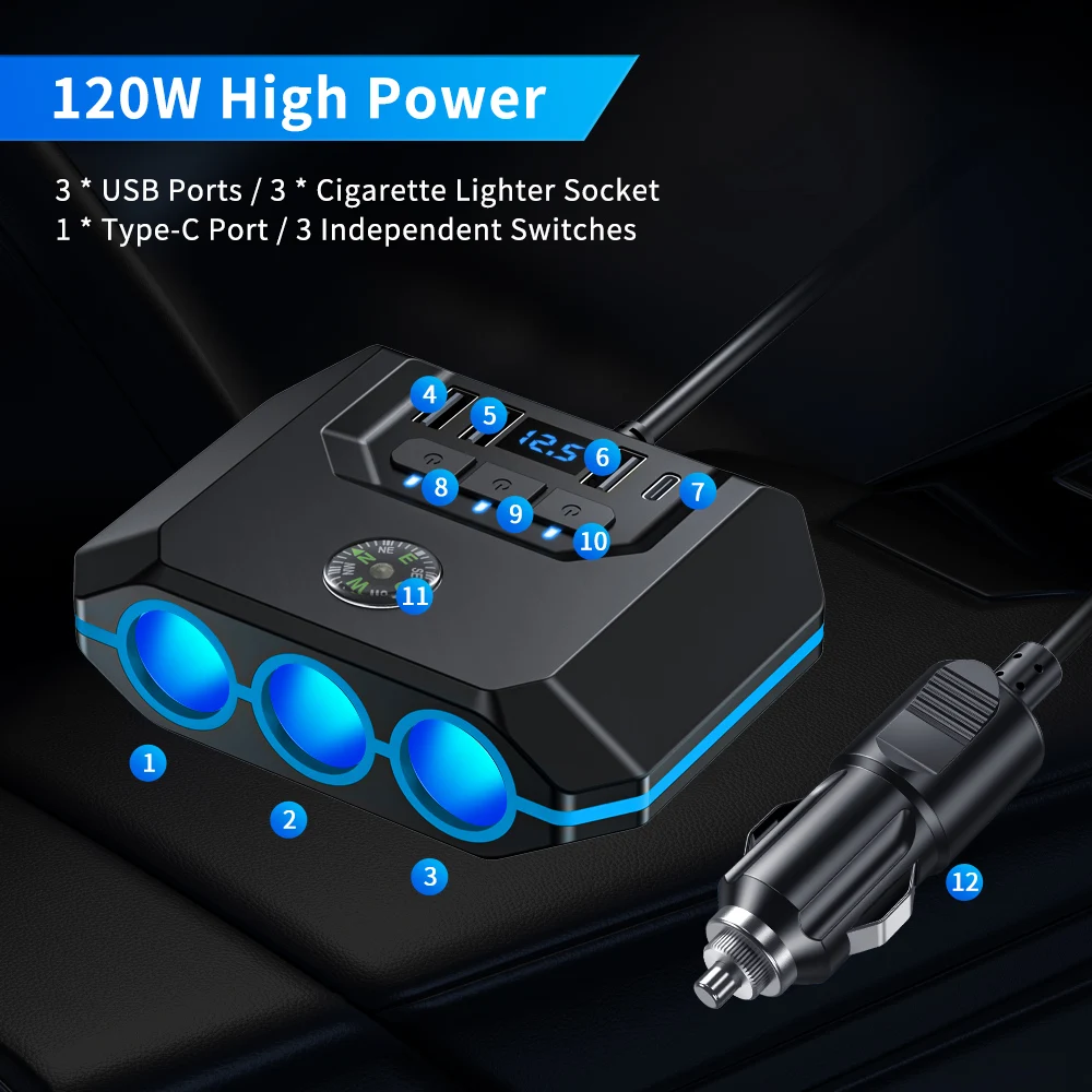 1. 7-in-1 cigarette lighter adapter, cigarette lighter charger equipped with 4 USB charging ports and 3 cigarette lighter sockets with a total power of 120W