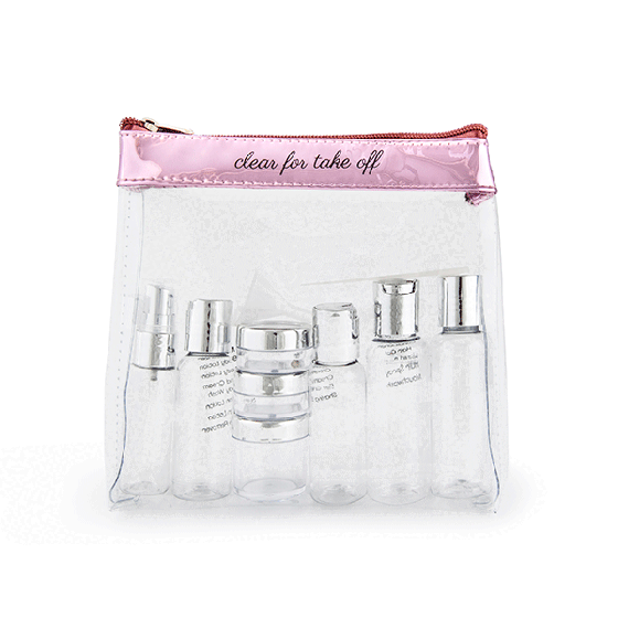 From our Bottles Collection. The travel case is a see-through toiletry bag with a fashionable flair and sturdy zipper. This bag meets the latest TSA regulations to make packing for your next flight comfortable, efficient, and fun. Deluxe version includes assorted containers. You can travel in style with our shiny rose gold bottle kit. The assortment of included bottles and jars will keep all your beauty essentials organized for your next getaway.