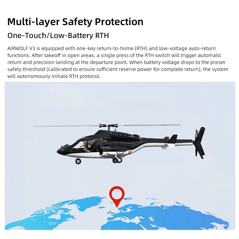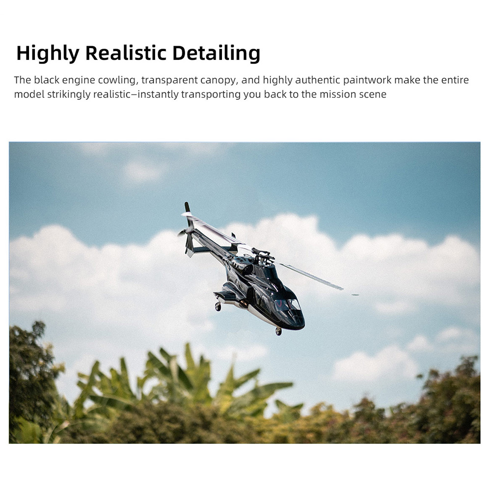This Airwolf scale RC helicopter is great for kids and adults, upgrade with more functions for more fun. The design is optimized according to the proportion of the original machine. All details and openings are restored as much as possible. Recommended for ages 14 & up.
