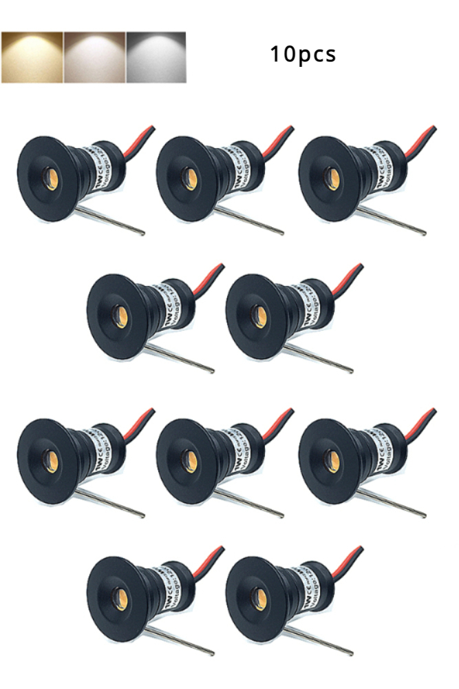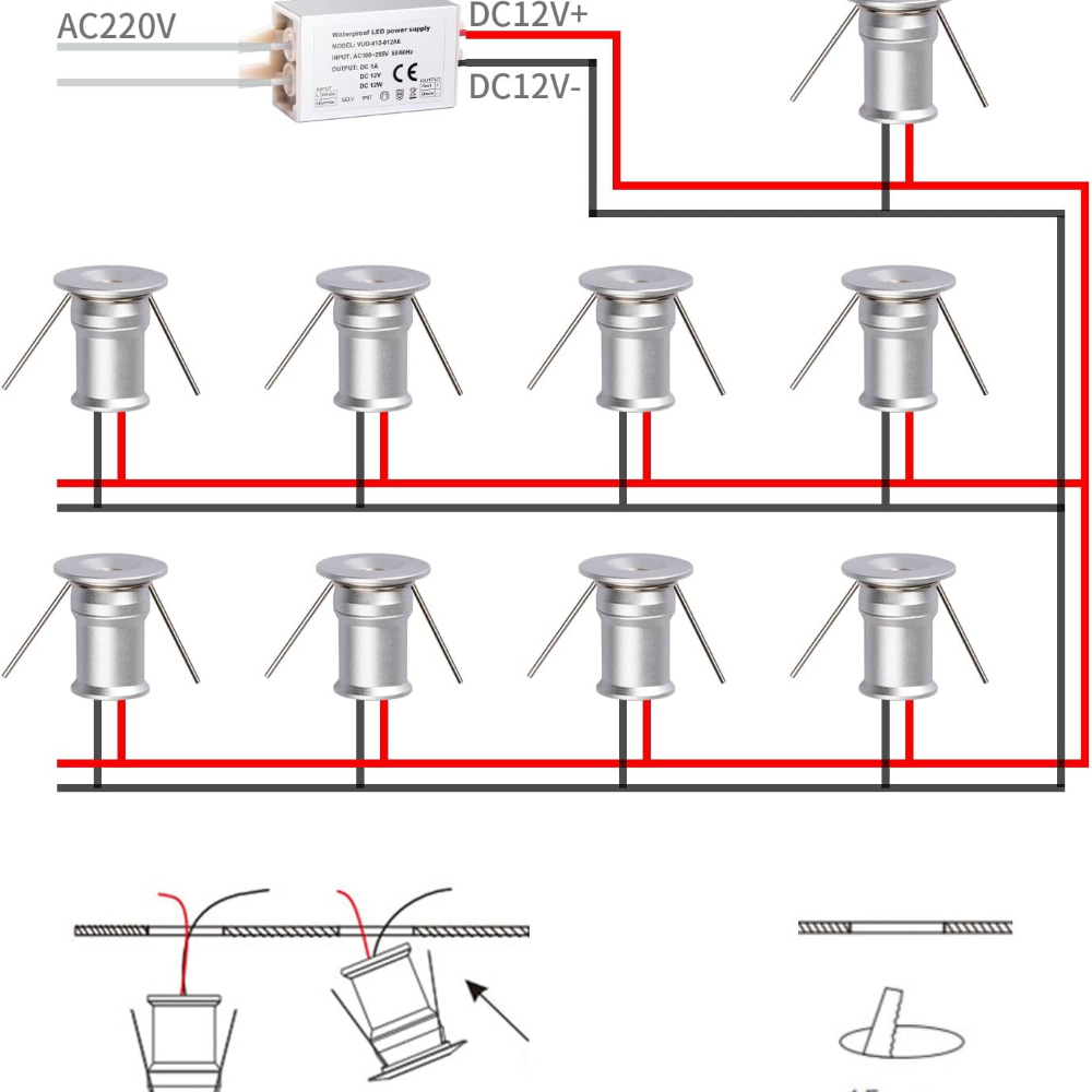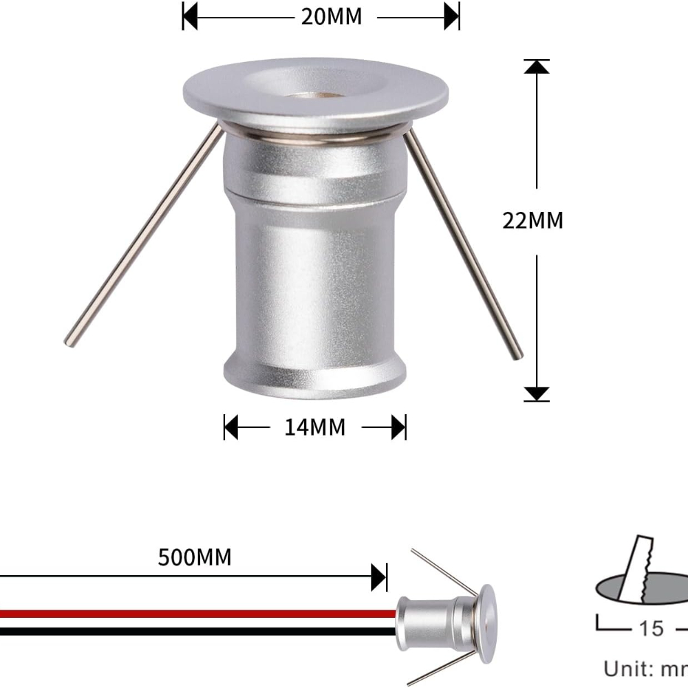 Specification Power: 1W Input Voltage: DC12V Waterproof Grade: IP55 Color rendering index: >80 Ra Lumens: 95lm Beam Angle: 30/120 Material: Aluminum Color: Warm White 3000K; Natural White 4000K; Cool White 6000K Size: D20mm x25mm Hole Size: 15mm Cable Length: 400mm Install: Reccessed Shell Color: Silver Usage: Room Decorative Light, KTV Rooms, Stairs Indicating Light, Cabinet Showcase Light, and other DIY Design Lighting Warning: This lamps need connect with the DC12V power. 110V or 220V voltage will damage the lamps and is very dangerous! Pakage Inlude 10PCS or 20PCS mini 1W spotlight Silver or Black (10pcs spotlight 1pcs LED Driver/20pcs spotlight2 pcs LED Driver)