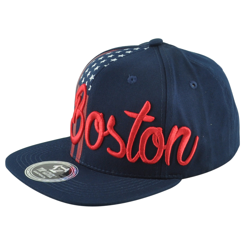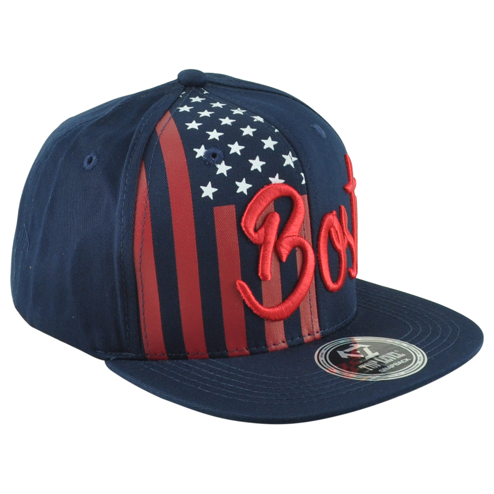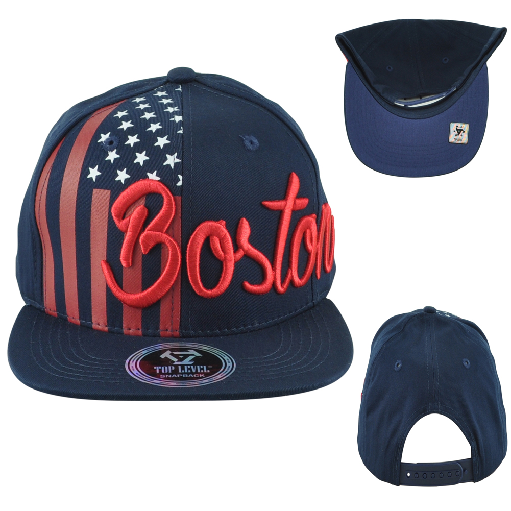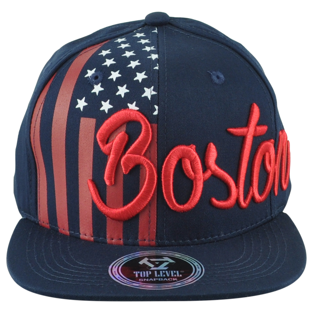 Description: Represent Boston with this unique hat. This Top Level hat features Boston embroidered on the front. Stripes and stars printed on the front. Material 100% Cotton. Color navy and red. Flat Bill. Adults fits. This hat contains, adjustable snapback closure. Authentic Merchandise