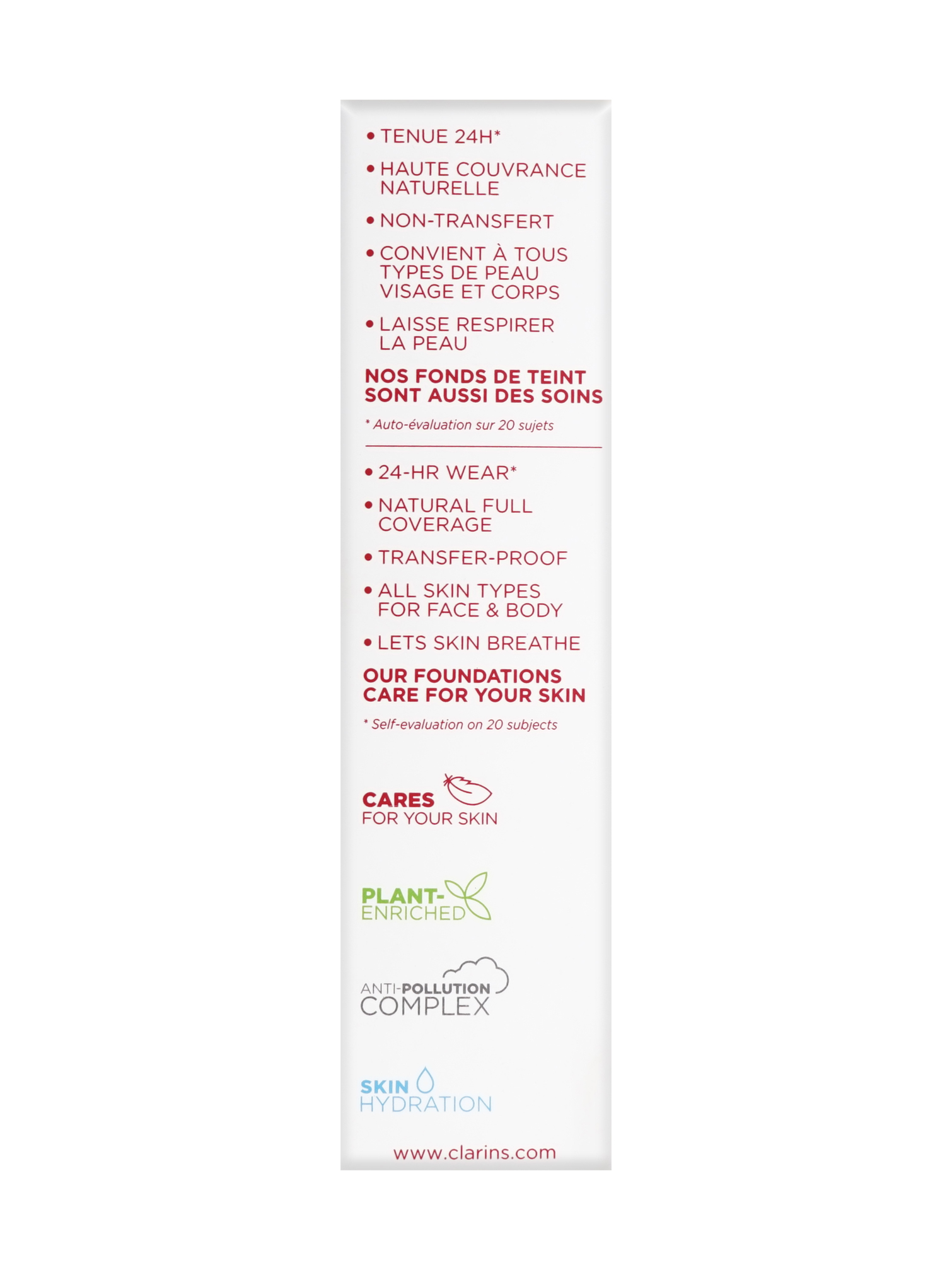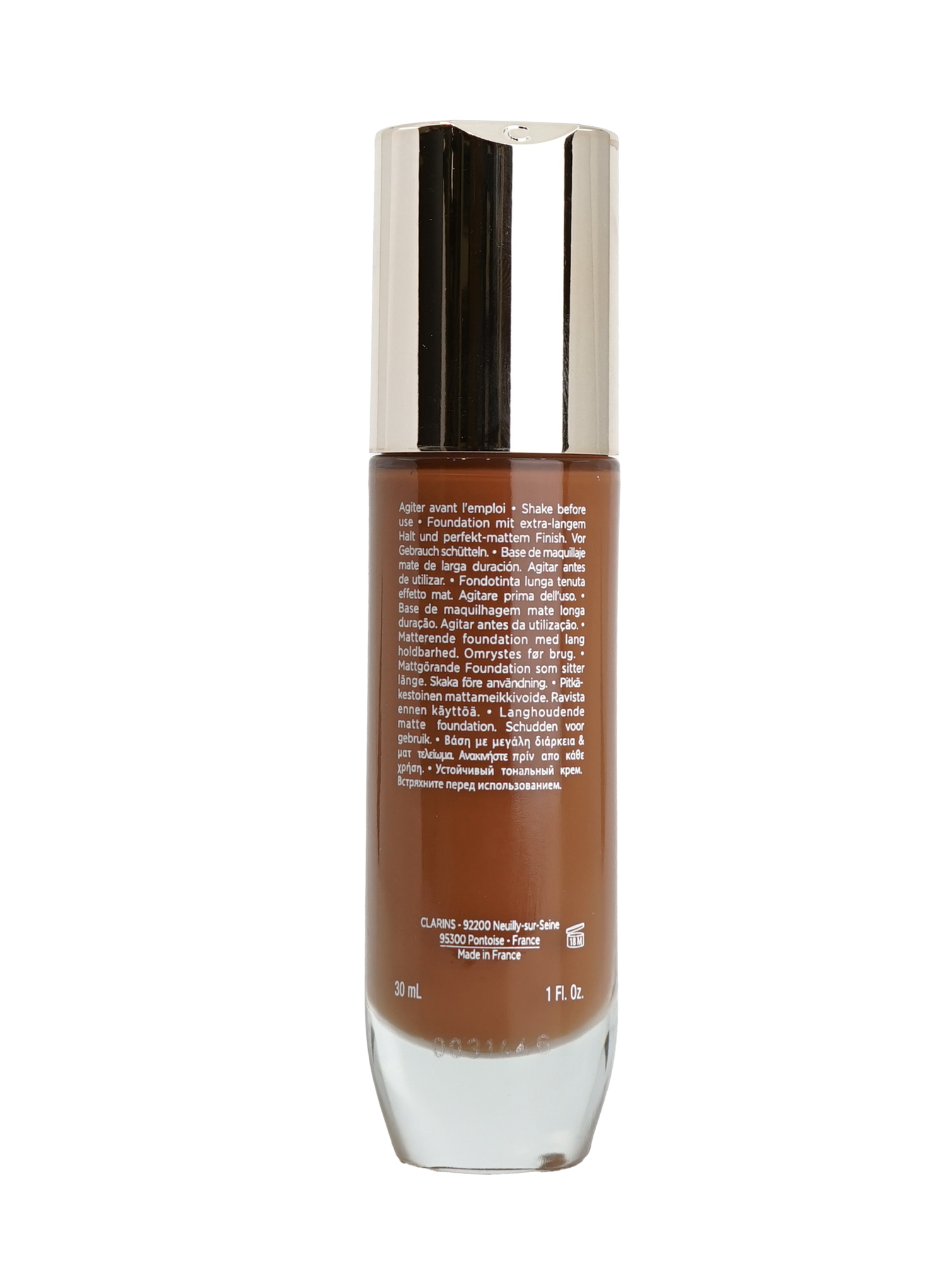 Clarins Everlasting Matte Foundation in shade 119W Mocha is created for all skin types. This advanced formula seamlessly blends into your skin, providing a flawless finish that lasts throughout the day. Leaves your skin with a perfect matte finish and protects from excess oil. Enriched with skincare benefits, it not only conceals imperfections but also nourishes and hydrates your skin, leaving it looking radiant and healthy. With a wide range of shades to choose from, finding your perfect match has never been easier. Provides full coverage with a lightweight formula that will not clog pores or look cake like. Provides 24 hours coverage and 24 hour hydration for your skin. Goes on easily and blends flawlessly, leaving kin looking natural. This formula is transfer proof and smudgeproff. Helps to even skin tone and hide imperfections. Ingredients include Argan Oil, White Tea Extract, Organic Oat Sugars, Bamboo Powder, and Organic Quinoa. How to apply: Start with a clean and moisturized face. Depending on your preference and the texture of your foundation, you can use a makeup sponge (such as a beauty blender), a foundation brush, or even clean fingers for application. Start by applying foundation to the center of your face (nose, cheeks, chin) and blend outward. This ensures even coverage without overloading product on the perimeter of your face. Use your chosen tool to blend the foundation into your skin using stippling, tapping, or buffing motions. Blend seamlessly into your hairline, jawline, and neck to avoid any harsh lines. If you need more coverage in certain areas, you can layer foundation gradually. Focus on patting or stippling additional product onto those areas rather than swiping to avoid disrupting the base layer. If you have oily skin or want to increase the longevity of your foundation, you can set it with a light dusting of translucent powder using a fluffy brush.