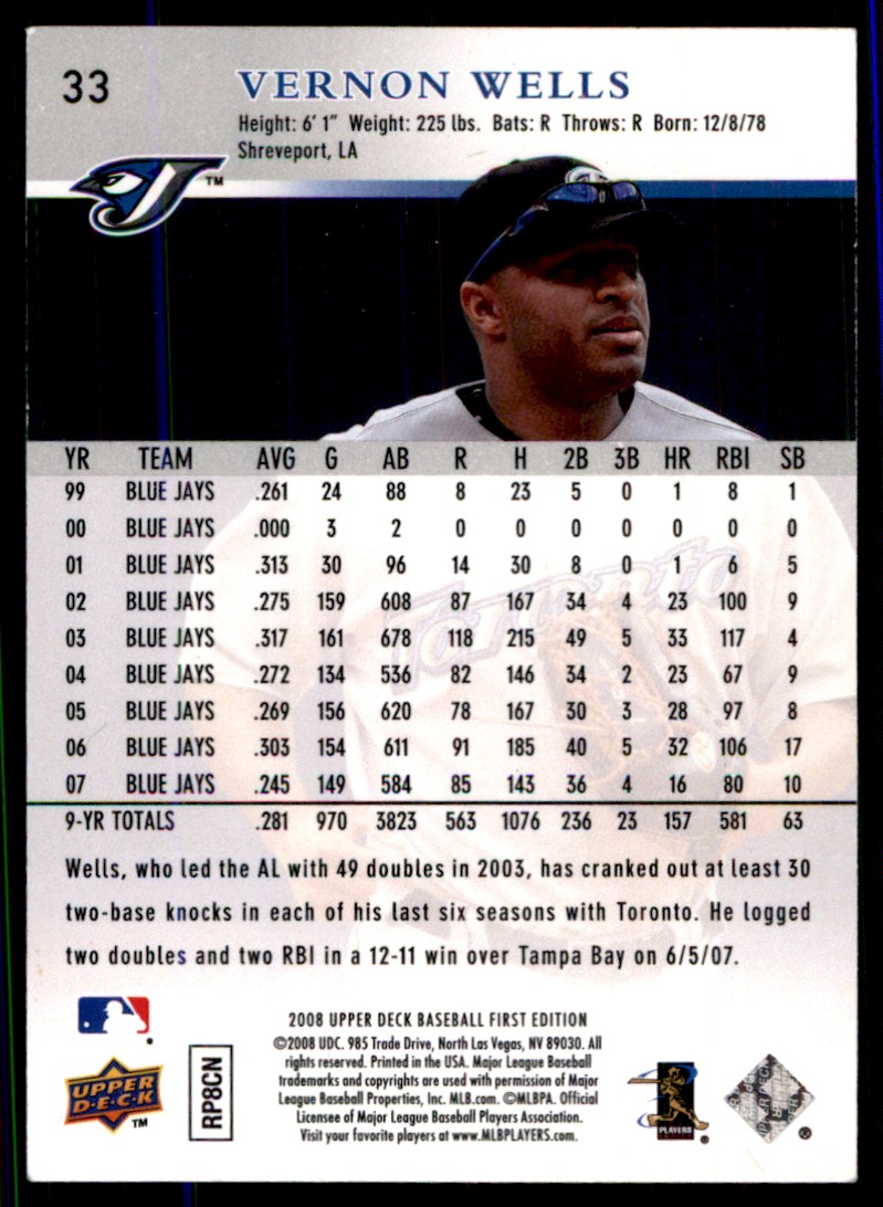| 2008 Upper Deck First Edition Vernon Wells Toronto Blue Jays #33 |