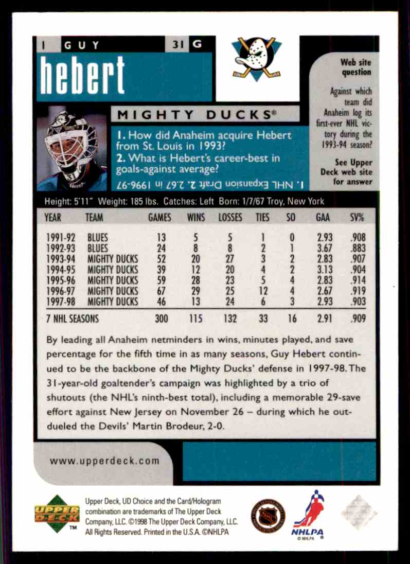 | 1998-99 Upper Deck UD Choice Guy Hebert #1 |