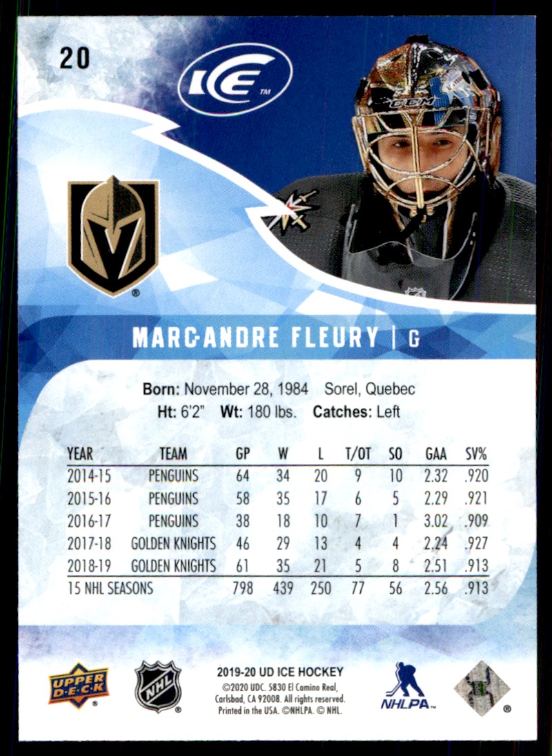 | Description: | Marc-Andre Fleury | | Category: | Hockey | | Year: | 2019 | | Product: | Upper Deck Ice | | Team: | Vegas Golden Knights | | Card Number: | 20 | | Dimensions: | 3½" x 2½" | | SKU: | HK B0076 R02 A (68) |