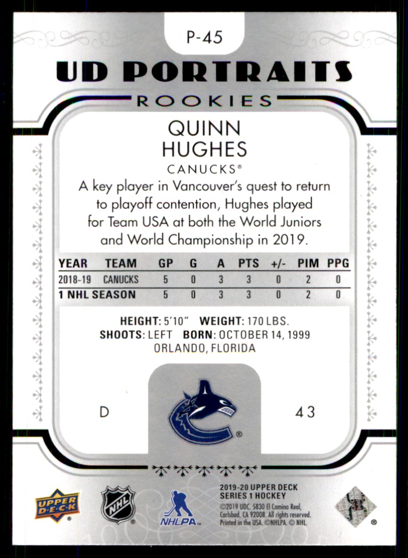 | 2019-20 Upper Deck UD Portraits Quinn Hughes Vancouver Canucks #P-45 |