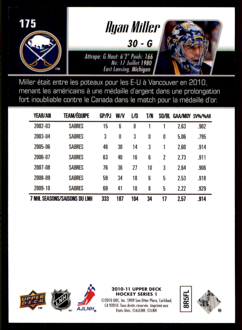 | 2010-11 Upper Deck Ryan Miller Buffalo Sabres #175 |