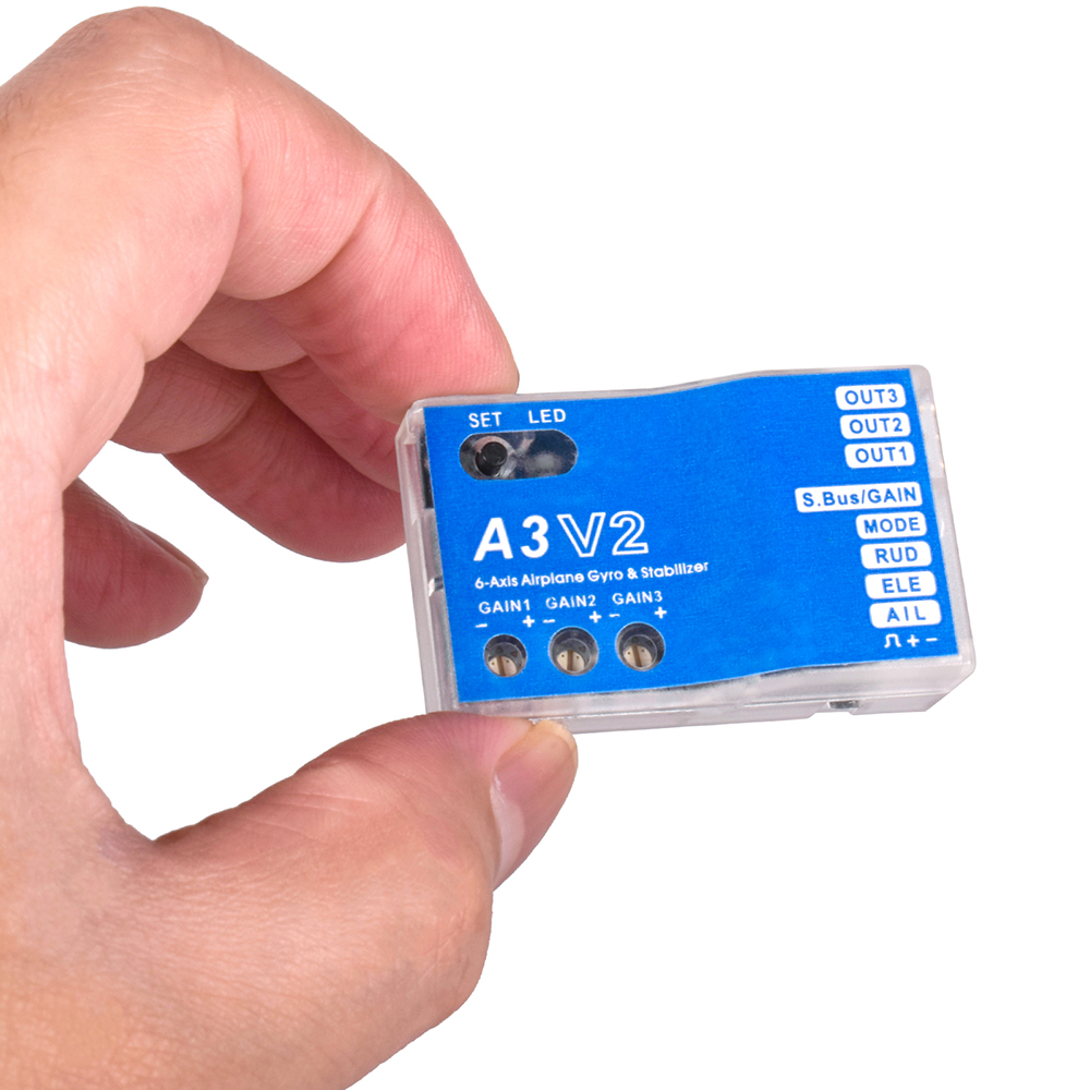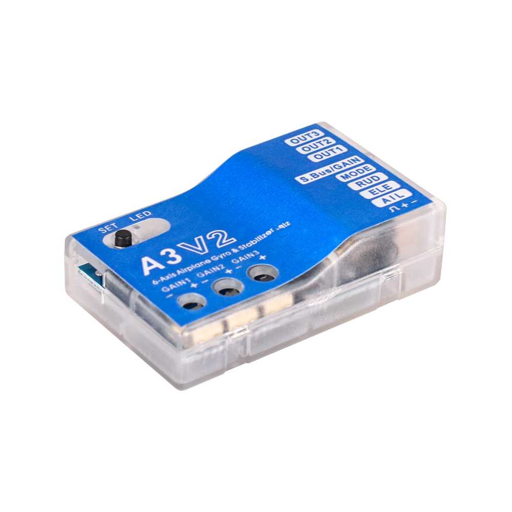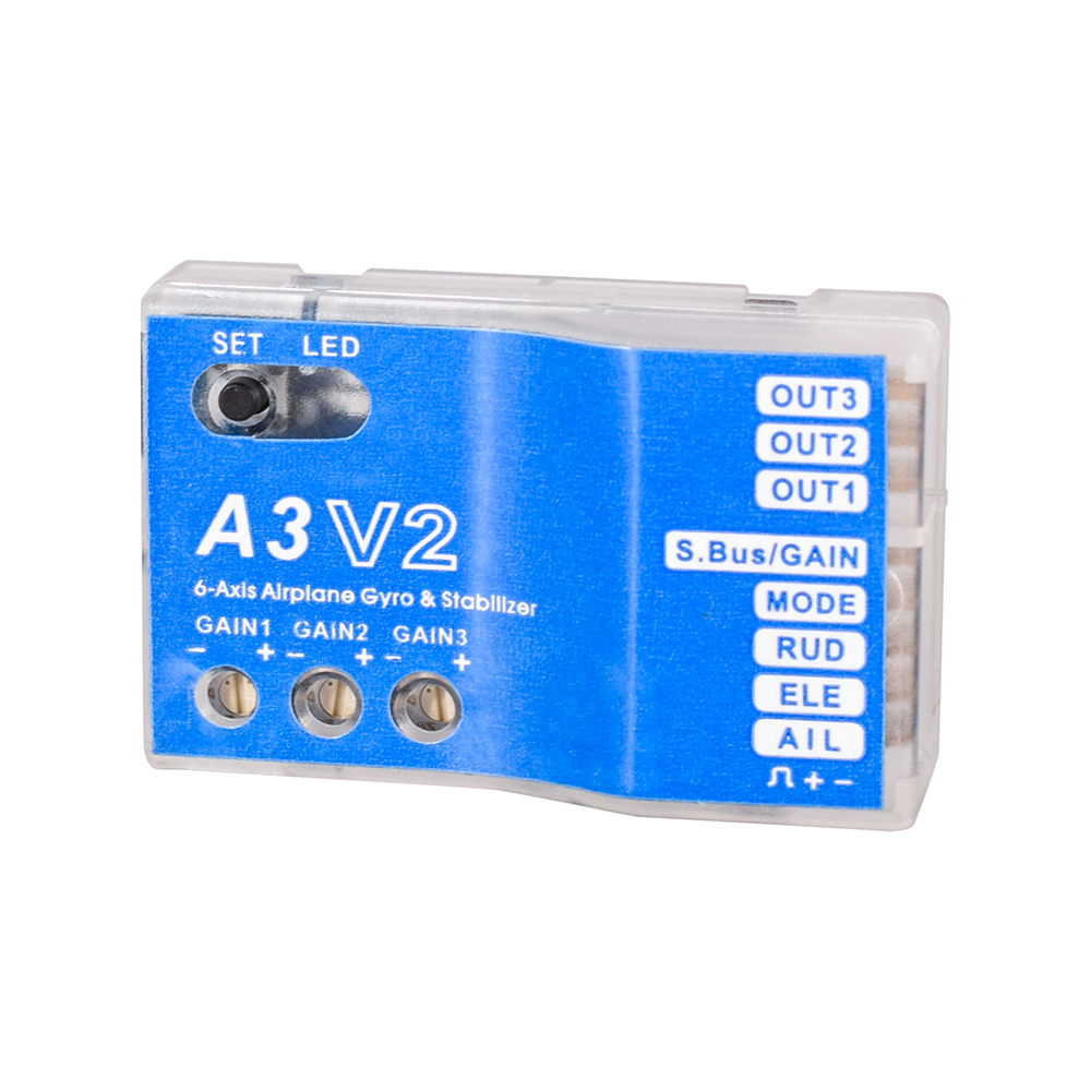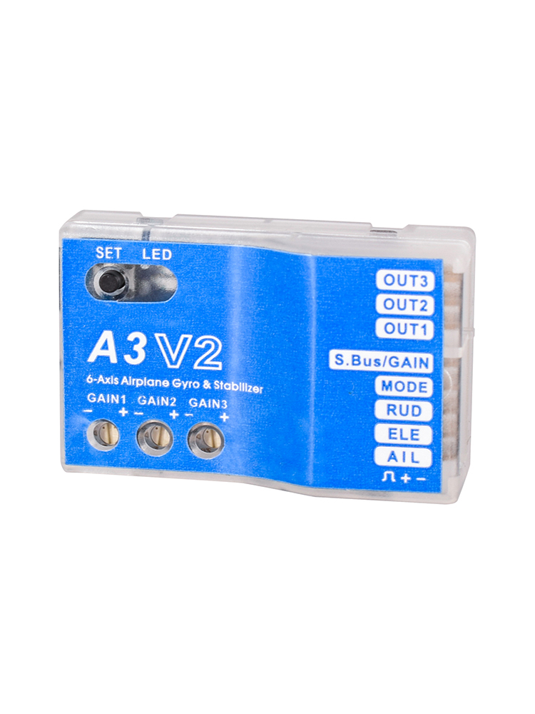 3-Axle Gyro A3 V2 Stabilizer For RC Fixed-Wing Airplane. With 4 Flight Modes, 3 Types Of Airfoil, 3 Kinds Of Servo System Working Frequency, Separated Gain Adjustment For Each Flight Mode, Automatic Stick Centering, Extremely Suitable For Beginners.