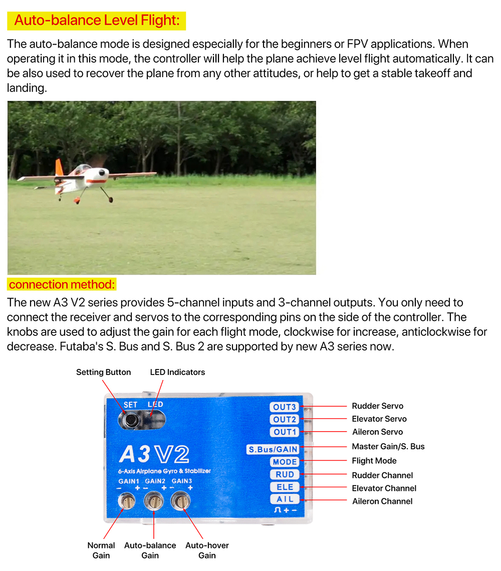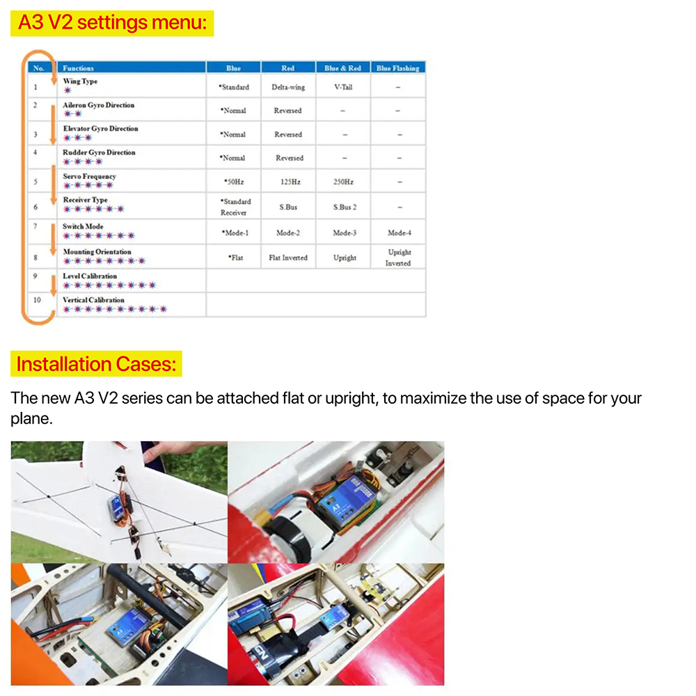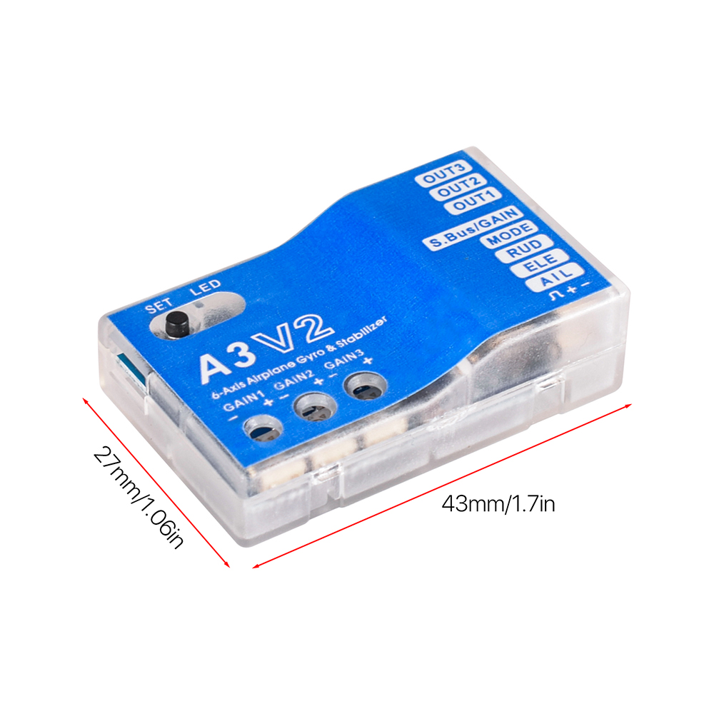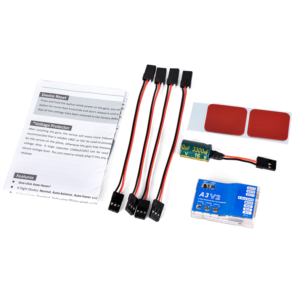 3-Axle Gyro A3 V2 Stabilizer For RC Fixed-Wing Airplane. With 4 Flight Modes, 3 Types Of Airfoil, 3 Kinds Of Servo System Working Frequency, Separated Gain Adjustment For Each Flight Mode, Automatic Stick Centering, Extremely Suitable For Beginners.