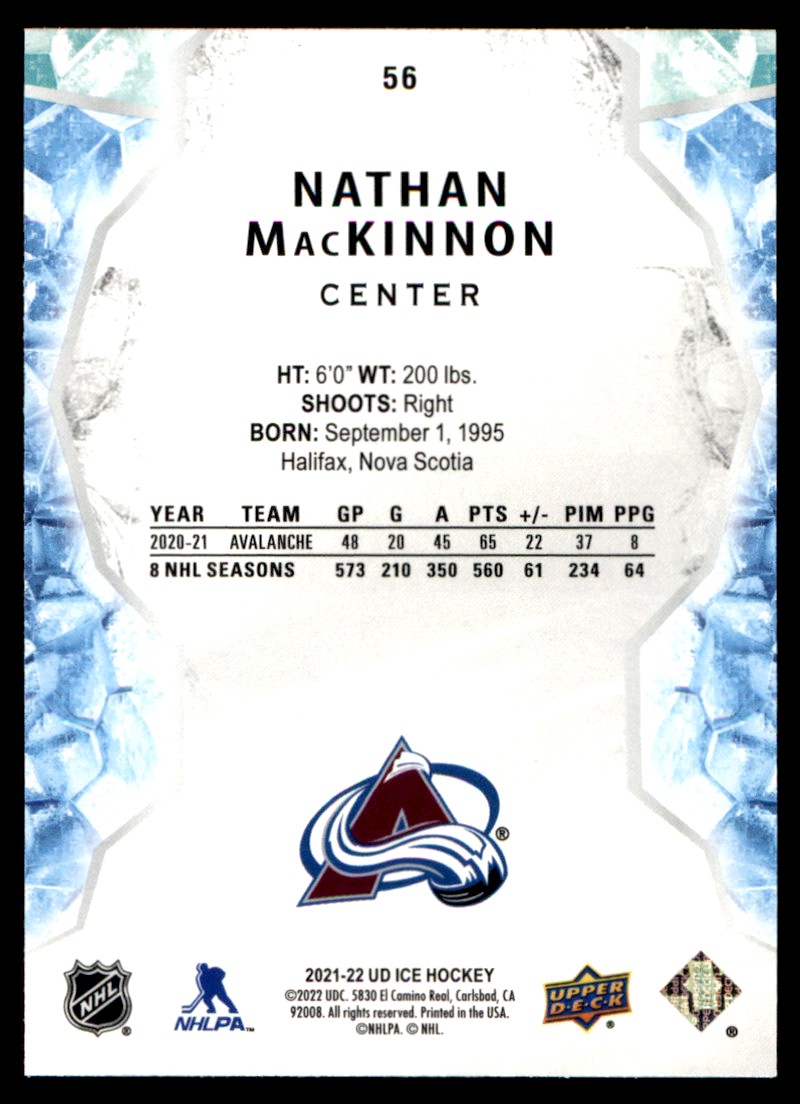 | 2021-22 Upper Deck Ice Lavender Nathan MacKinnon Colorado Avalanche #56 |