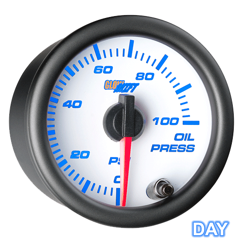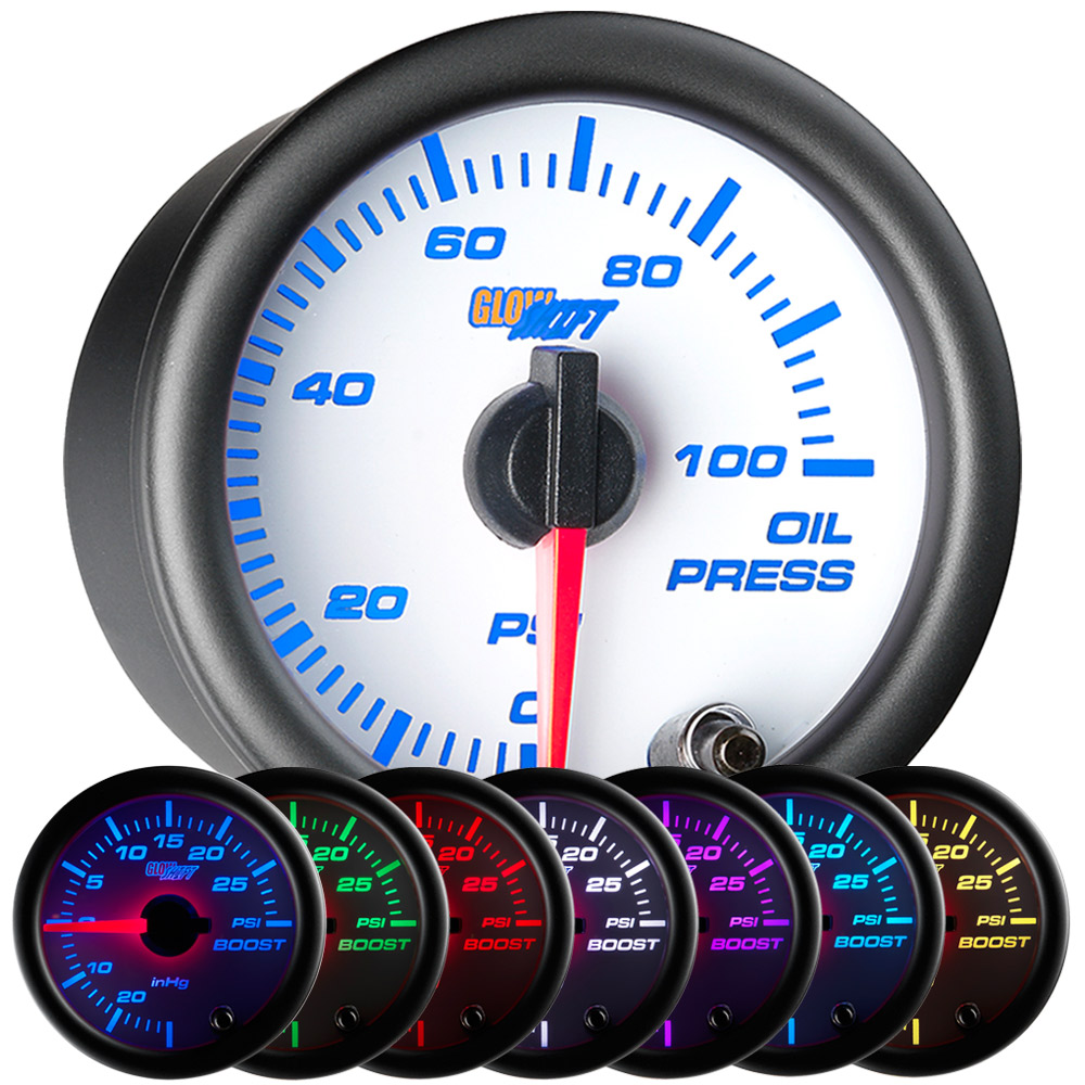 GlowShifts White 7 Color Series Oil Pressure Gauge allows you to easily monitor your vehicles oil pressure, ensuring your bearings, crankshaft, and other vital engine parts stay properly lubricated. Included with this oil pressure gauge is a 1/8th NPT electronic oil pressure sensor that will accurately read your vehicles oil pressure from 0-100PSI. Featuring an illuminated red needle that sweeps 270 degrees and is powered by stepper motor technology, you can rest assured that all gauge readings will be extremely accurate. GlowShifts oil pressure gauge also features an easy to read magnified lens and 7 color through dial LED lighting that lets you match your factory dash lights or add a custom look to your interior. Our 7 color through dial LED lighting system lets the user easily cycle through 7 solid color modes, along with 2 color cycle modes, and for easier night driving the LEDs can be dimmed 30% when connected to your factory headlight switch. With the included color memory recall feature you dont need to worry about adjusting the color of your gauge every time you turn your vehicle. The included electronic pressure sensor can be installed by purchasing either GlowShifts Oil Filter Sandwich Adapter or t-fitting. GlowShift stands behind all of its products by including free lifetime technical support and a 60 day limited warranty with every gauge purchase.