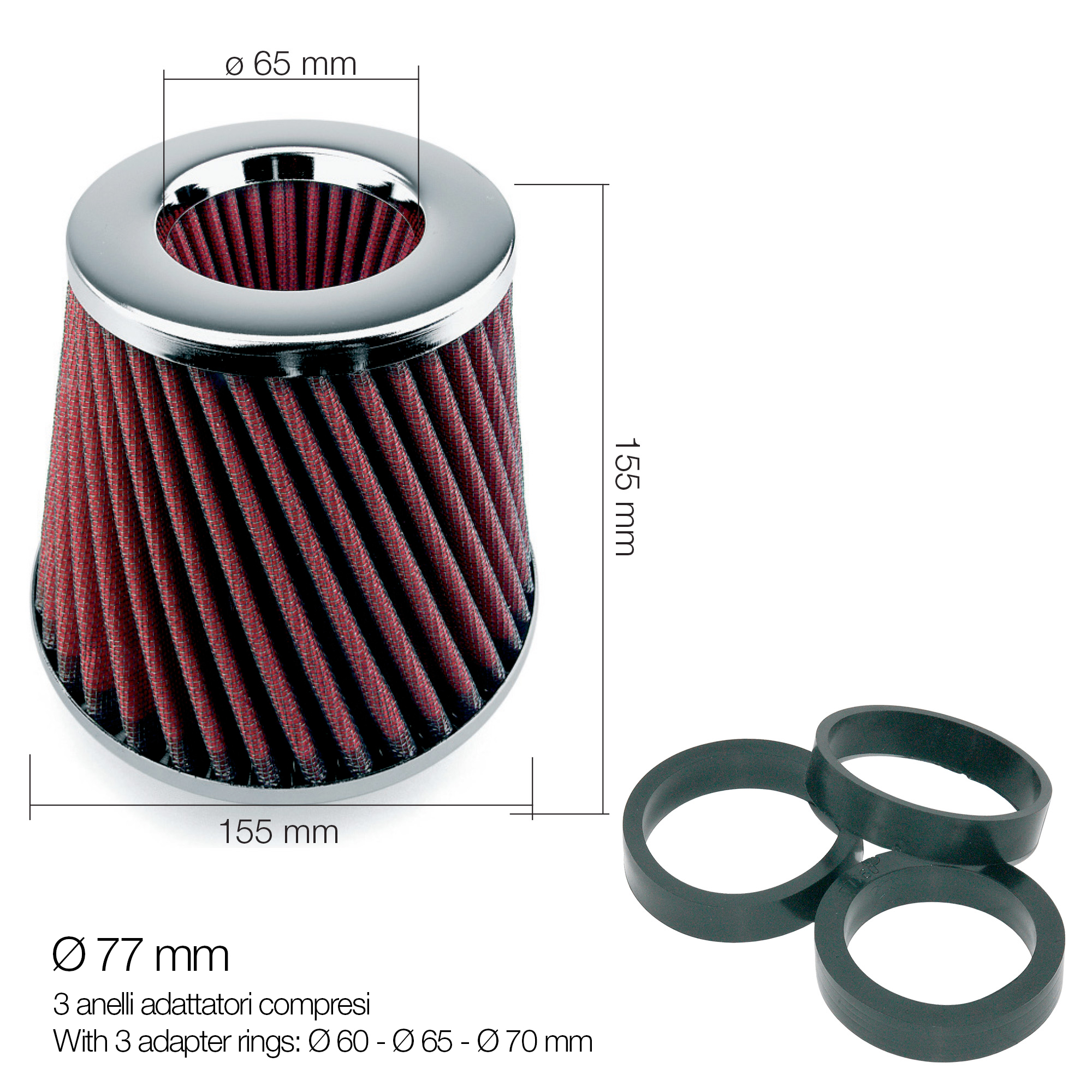 Roter 77-mm-Universal-Bikonischer-Spiralluftfilter mit 3 Simoni Racing-Adapterringen