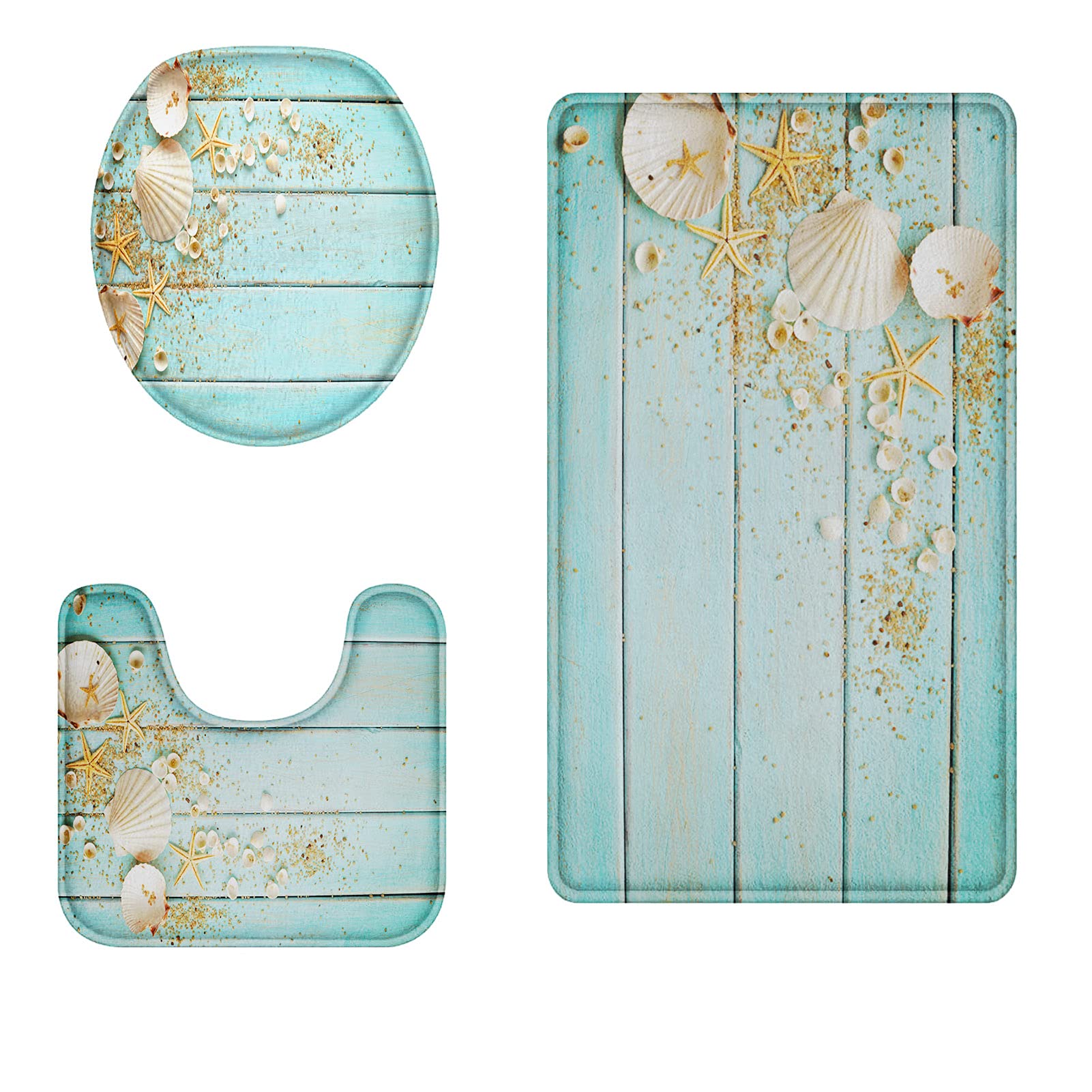 - The Size of Beach Seashell Bathroom Rug Set of 3:Bath Mat - 32"L * 20"W,U-Shaped Mat - 18"L * 15.7W,Universal Lid Cover - 17.5"L * 14.5"W.Improved beach seashell bath mat set is thicker ordinary bathroom rug set.There will be a feeling of support and more comfort when you step on it.Protect your feet from the cold floor at the same time it protects your floor from moisture.