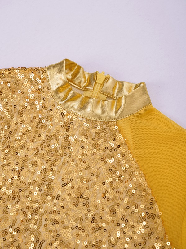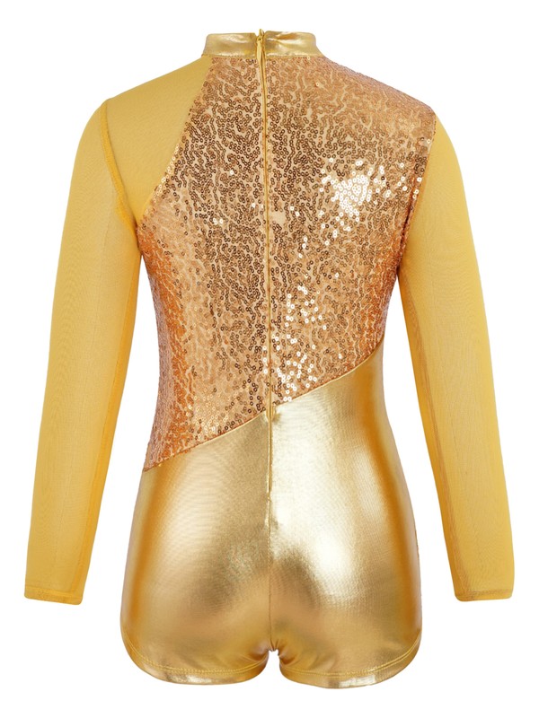 The leotards features with mesh patchwork style long sleeve and round collar, sparling sequins and metallic cloth style.