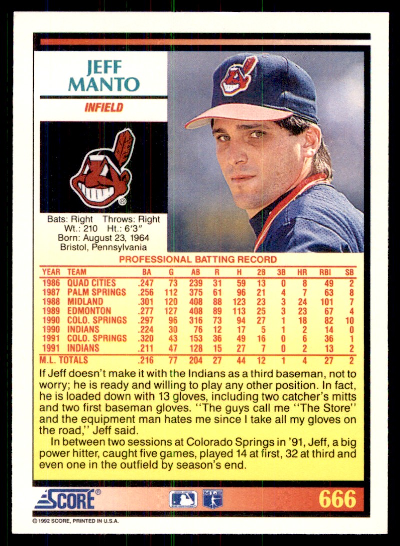 | 1992 Score Jeff Manto Cleveland Indians #666 |