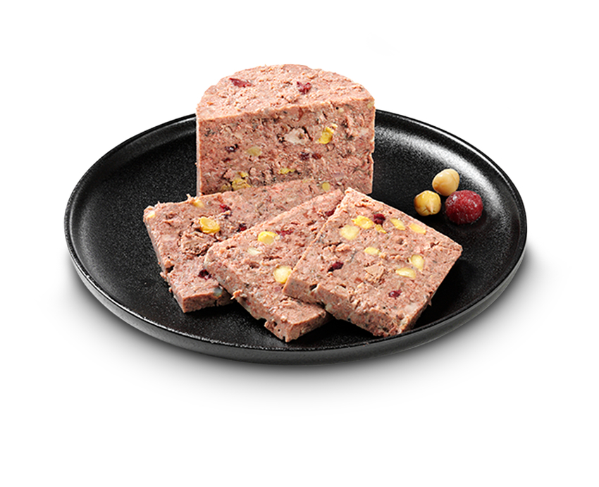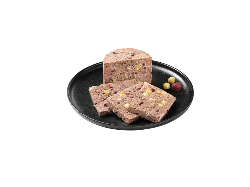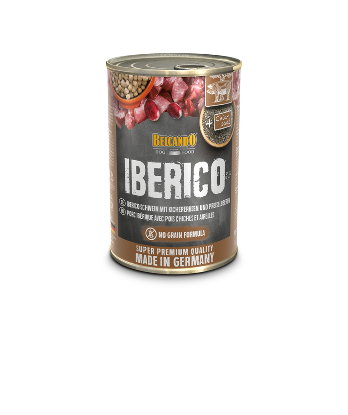 Zusammensetzung: Iberico Schweinefleisch, -lunge, -leber, -niere, -milz (65 %); Fleischbrühe (25,5 %); Kichererbsen, gekocht (5 %); Preiselbeeren (2 %); Chiasaat (1 %); Eierschalen, getrocknet (0,5 %); Mineralstoffe (0,5 %); Distelöl (0,5 %)