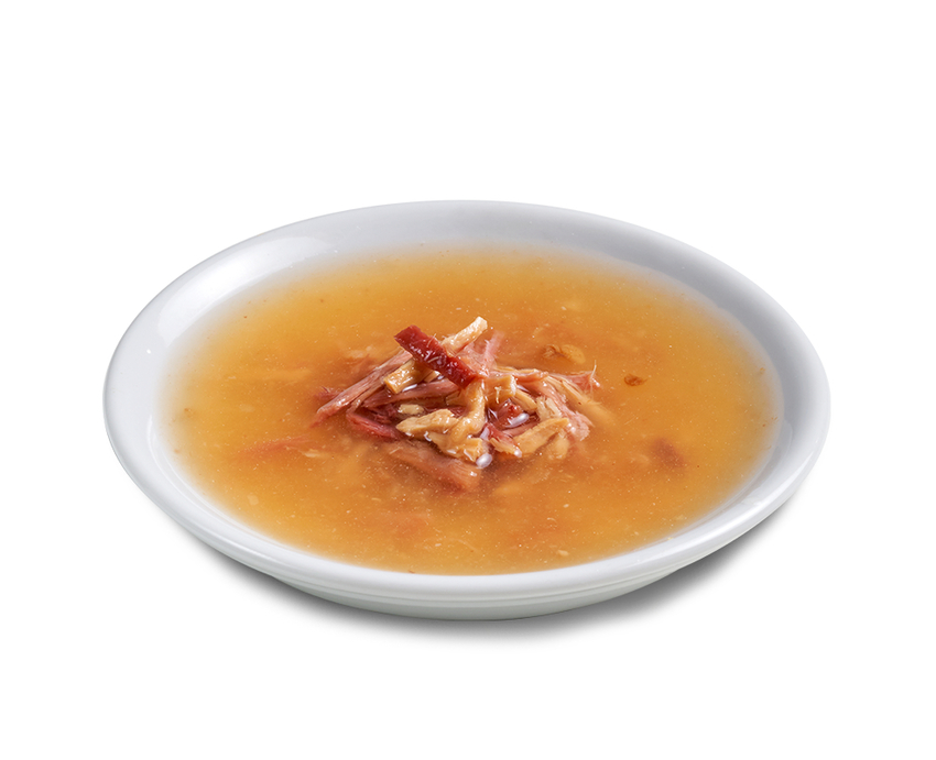 Zusammensetzung: Fleischbrühe vom Huhn und Rind (84%); Hühnerfleisch (9%); Rindfleisch (6%); Mineralstoffe (1%)