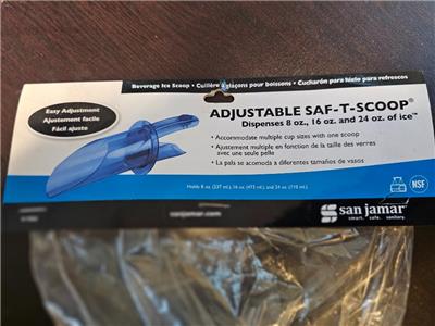 Eliminate multiple sizes of scoops by using the Adjustable Saf-T-Scoop®. Dispenses 8 ounce, 16 ounce, and 24 ounce, of ice to multiple sizes of cups. Adjustable Saf-T-Scoop® is designed for iced coffee drink applications and beverage stations. To select different measurements, simply adjust the thumb slider to match the amount you want and scoop.