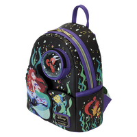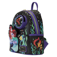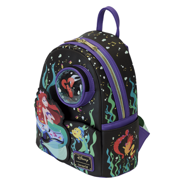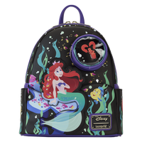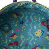 Little Mermaid 35th Anniv. Life Is The Bubbles Mini-Backpack. Celebrate 35 years of Disney's The Little Mermaid with this The Little Mermaid 35th Anniversary Life Is The Bubbles Mini-Backpack! The faux leather mini-backpack features applique, PVC and printed details - plus it glows in the dark! Graphics include mermaid Ariel and her best pals Flounder and Sebastian. Bag measures approximately 10 1/2-inches tall x 9-inches long x 4 1/2-inches wide. For ages 15 and up. Officially Licensed Product