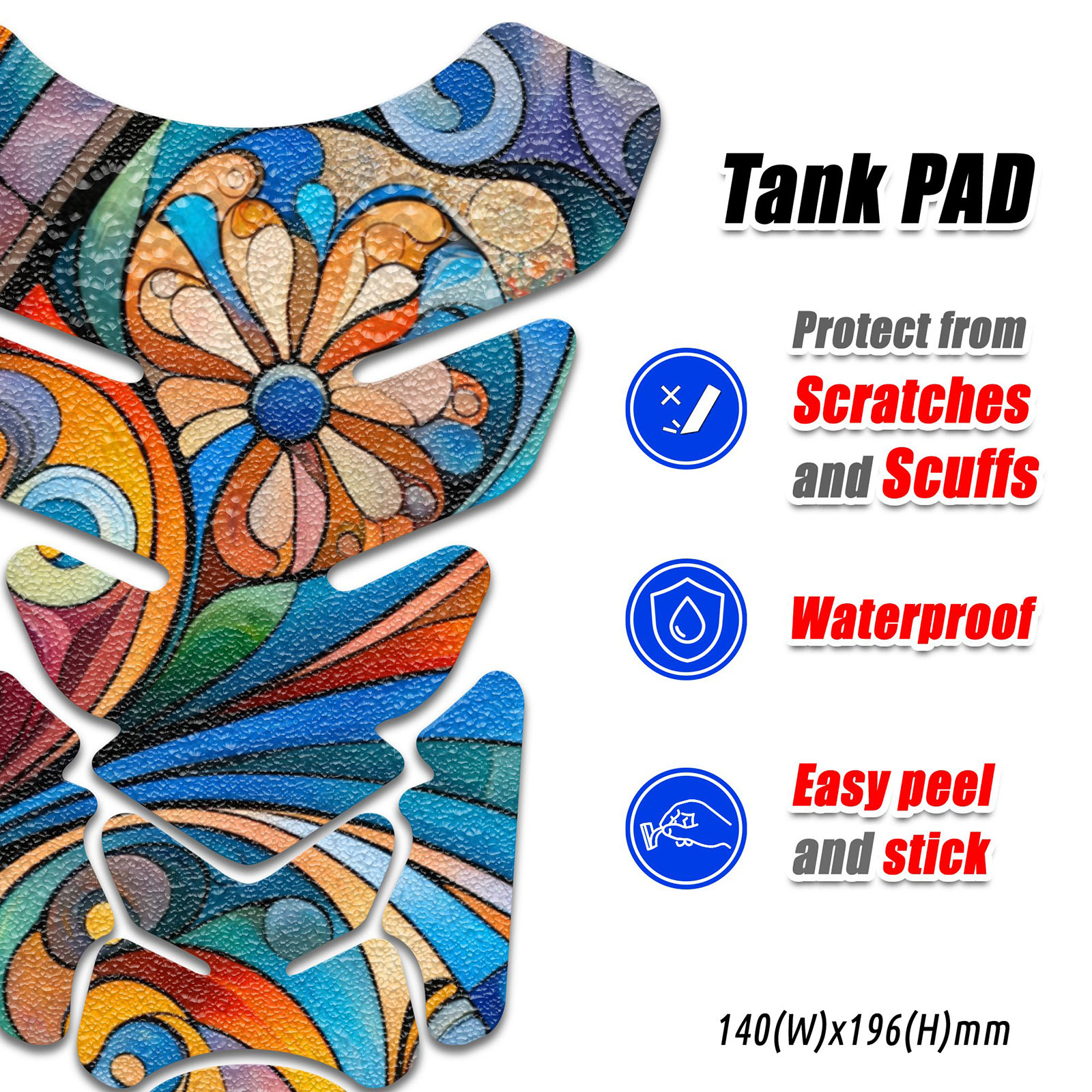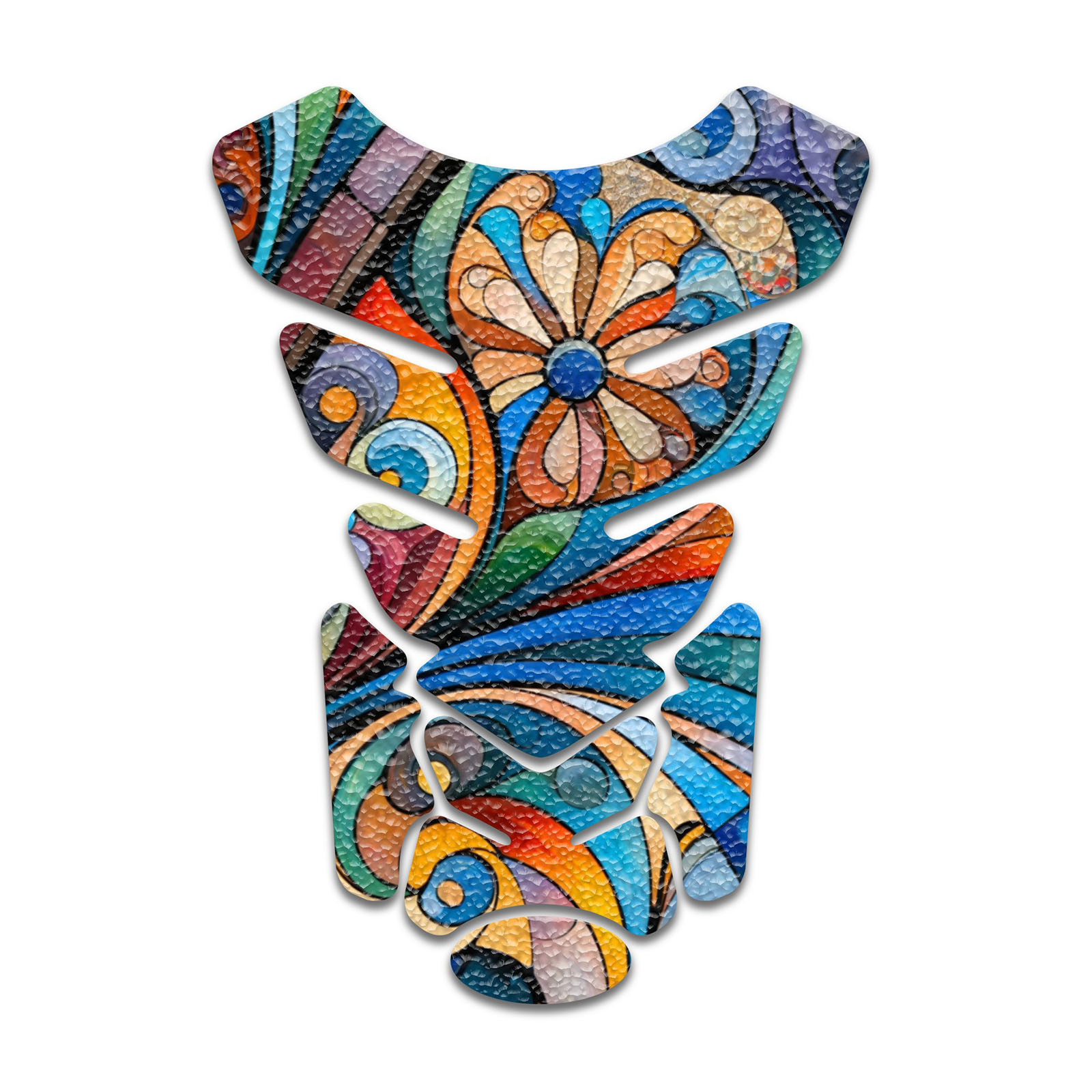 Enhance your motorcycle's aesthetic and improve your ride stability with this vibrant, abstract art motorcycle tank pad. Offering both protection and style, this tank pad features a stunning blend of colors in a mesmerizing design, providing a perfect blend of functionality and artistry. Easy to apply, this adhesive traction pad is designed to fit most motorcycle tanks, ensuring a non-slip grip for your knees and protection against scratches and wear. It's the perfect blend of practicality and flair for any bike enthusiast.