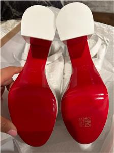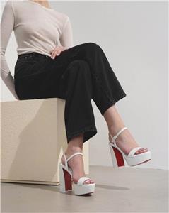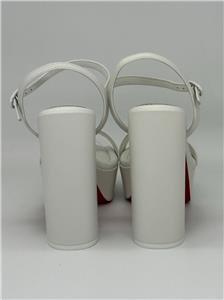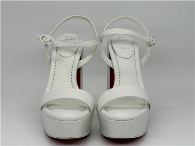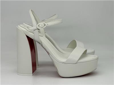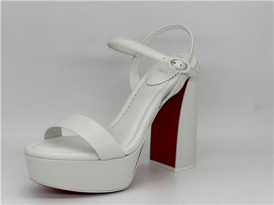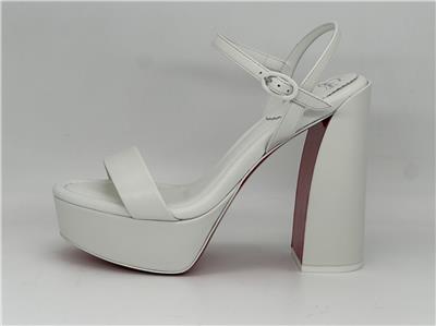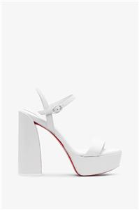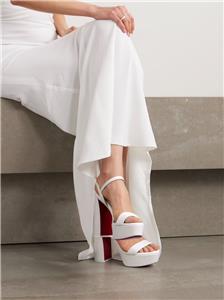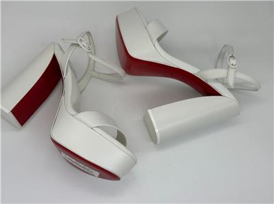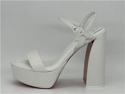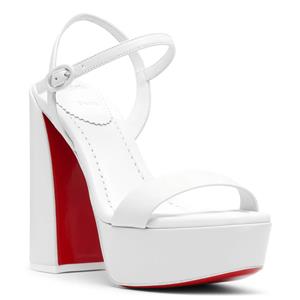 White leather platform sandals from Christian Louboutin. The Movida Jane sandals are made of leather with a rounded toe, two slim straps with a tonal clasp around the ankle set on a square, 130mm angled heel.