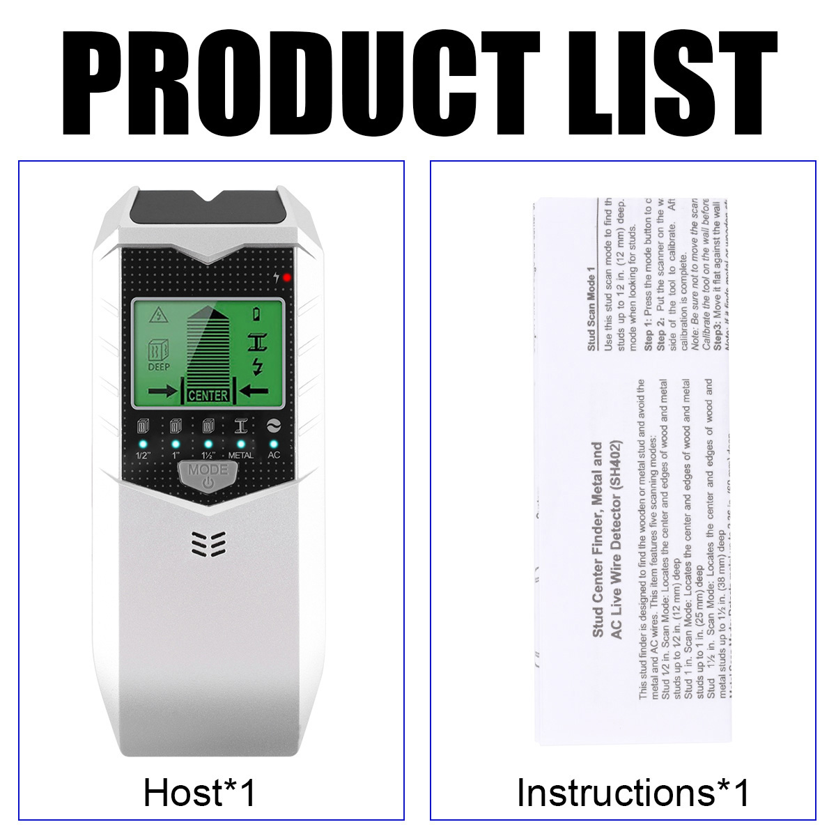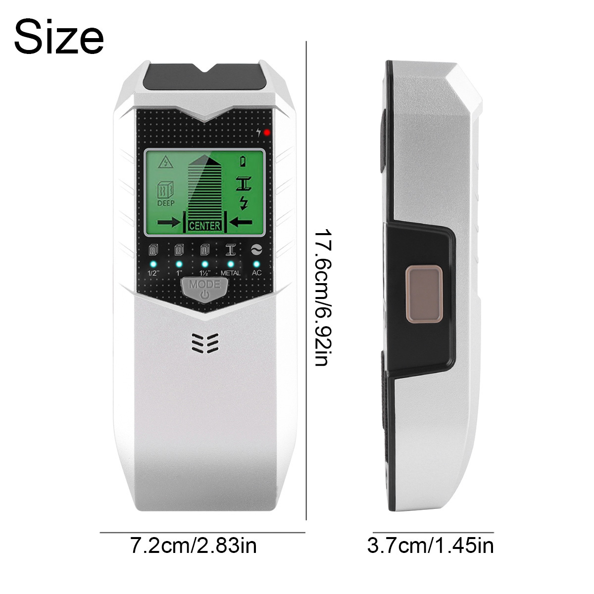 【5 in 1 Multifunction Detection】With multiple detection modes, Our upgraded stud finder can adapt your specific needs and projects. This wall stud finder features 5 scanning modes to accommodate various wall material thicknesses: 1/2 inch scan mode locates up to 1/2(13 mm) inch deep; medium scan locates up to 1(25 mm) inch deep; Deep scan locates up to 1.5(38 mm) inch deep for the center and edges of wood and metal studs. Metal scan detects metal up to 2.36 inch deep; AC scan detects live unshielded AC wire