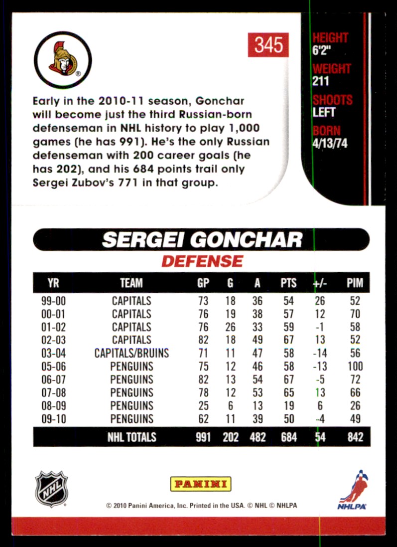 | 2010-11 Score Sergei Gonchar Ottawa Senators #345 |