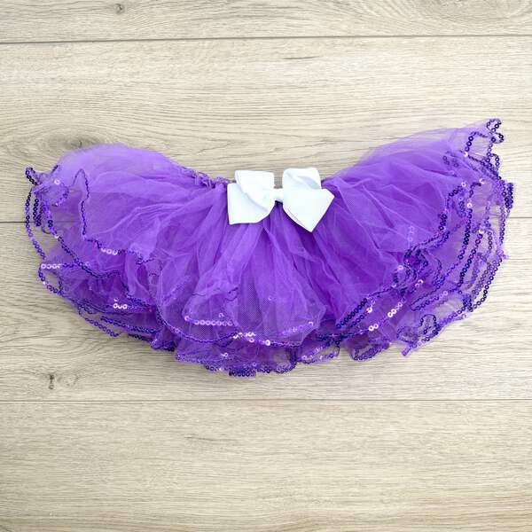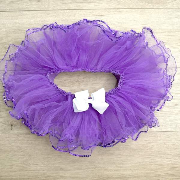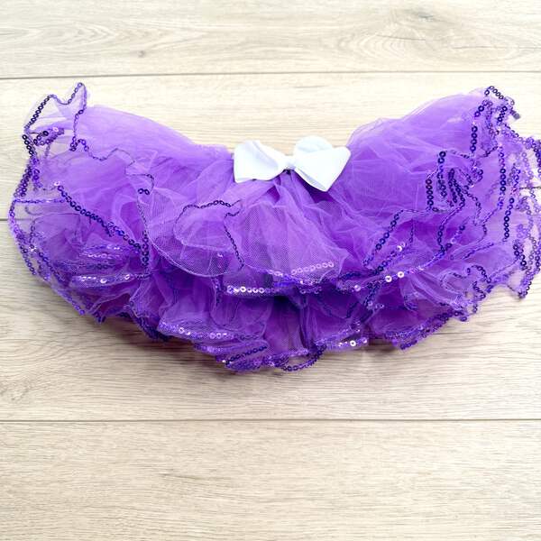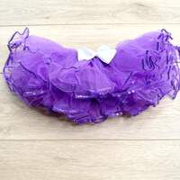 This enchanting tutu features a stretchy elastic waistband, ensuring a comfortable and flexible fit. The soft and lightweight materials make it perfect for playtime, birthdays, or any special occasion. With its purple and sequin color combination. Fits ages 3,4,5