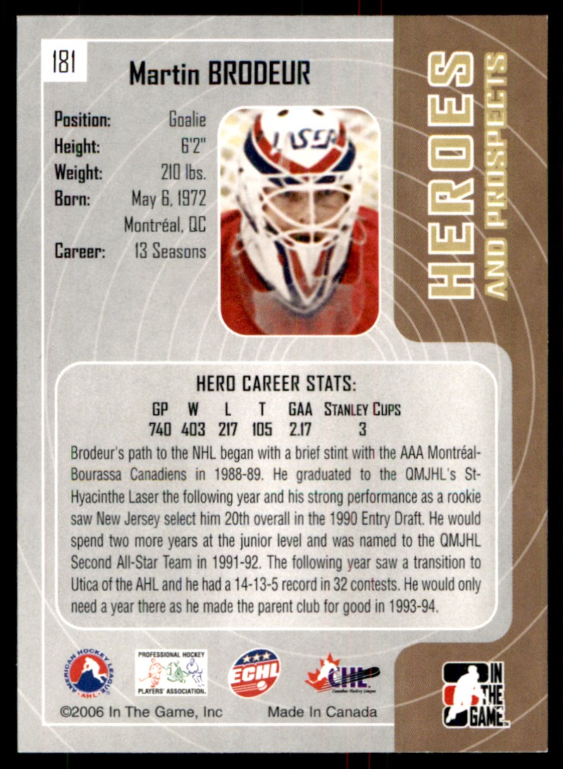 | 2005-06 In The Game Heroes and Prospects Martin Brodeur Saint-Hyacinthe Laser |