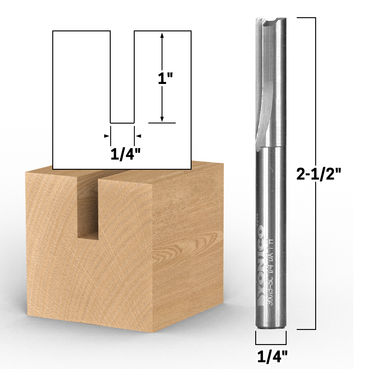 This bit features a cutting diameter of 1/4" and a cutting length of 1". Perfect for making dado grooves and all types of straight cut work. 1/4" shank.
