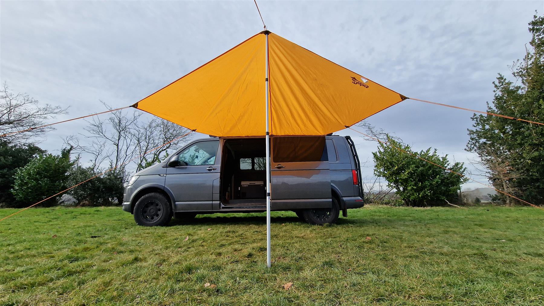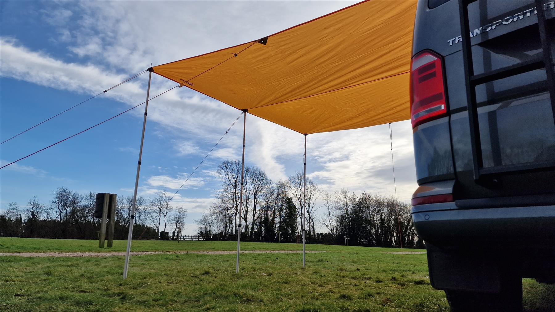 This Debus waterproof sun canopy’s trapezoid shaped design provides 8 square metres of shade/shelter at the side of a van and takes just a few minutes to connect to any early or modern VW Transporter and the height-adjustable poles allow the canopy to be set up in numerous shapes with rainwater runoff and can even be set up us a free standing tarp.