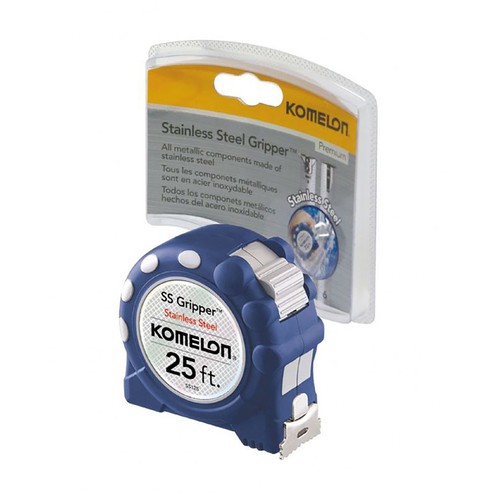Why would someone need a stainless steel tape measure. It's a must have because Komelon's stainless steel products resist rusting extending the products long life. The 25 feet x 1 inch stainless steel gripper is ideal for working in wet, dirty conditions and has a non-glare, two sided silver blade. The stainless steel gripper's metallic components are the toughest out there and fit in perfectly for use next to your wet saw. The blade on the stainless steel gripper has five layers starting with a stainless steel blade and finishing with a tough embossed finish. This tape measure will get you through it all whether wet or dry, clean or dirty. This is one tough tape.