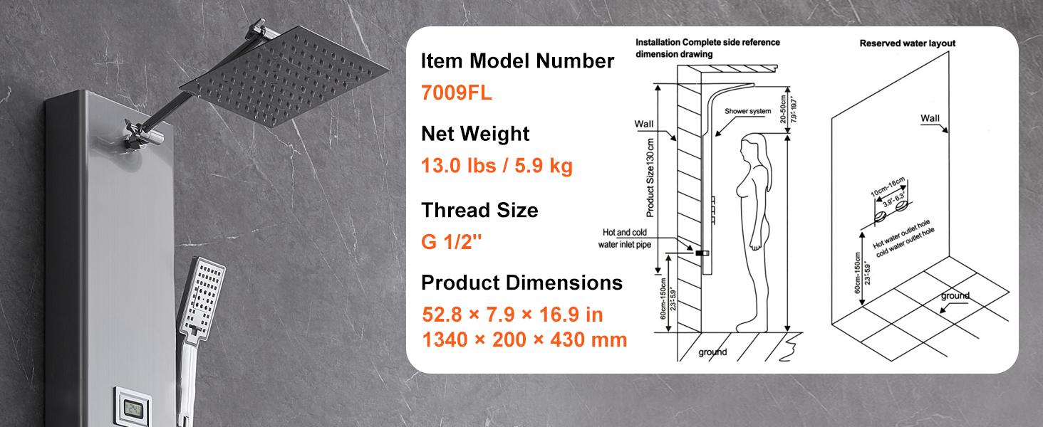 The G 1/2" interface thread size ensures a high water yield and stable pressure, making this shower system with body jets fit most bathroom fixtures and plumbing setups directly without needing a converter.