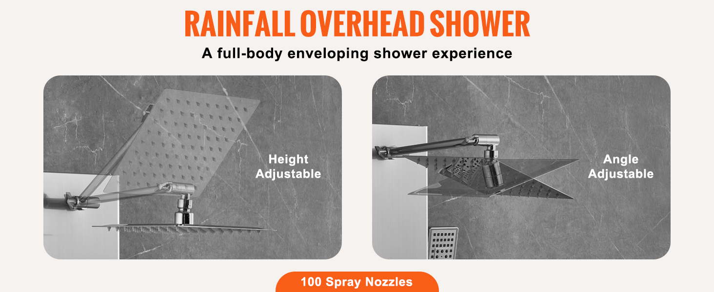 Tailor the height and angle to individual preferences with ease, catering to varying heights and needs within the family. Experience a comforting water flow from head to toe with the top spray, boasting 100 water outlet holes for a wide shower coverage area.