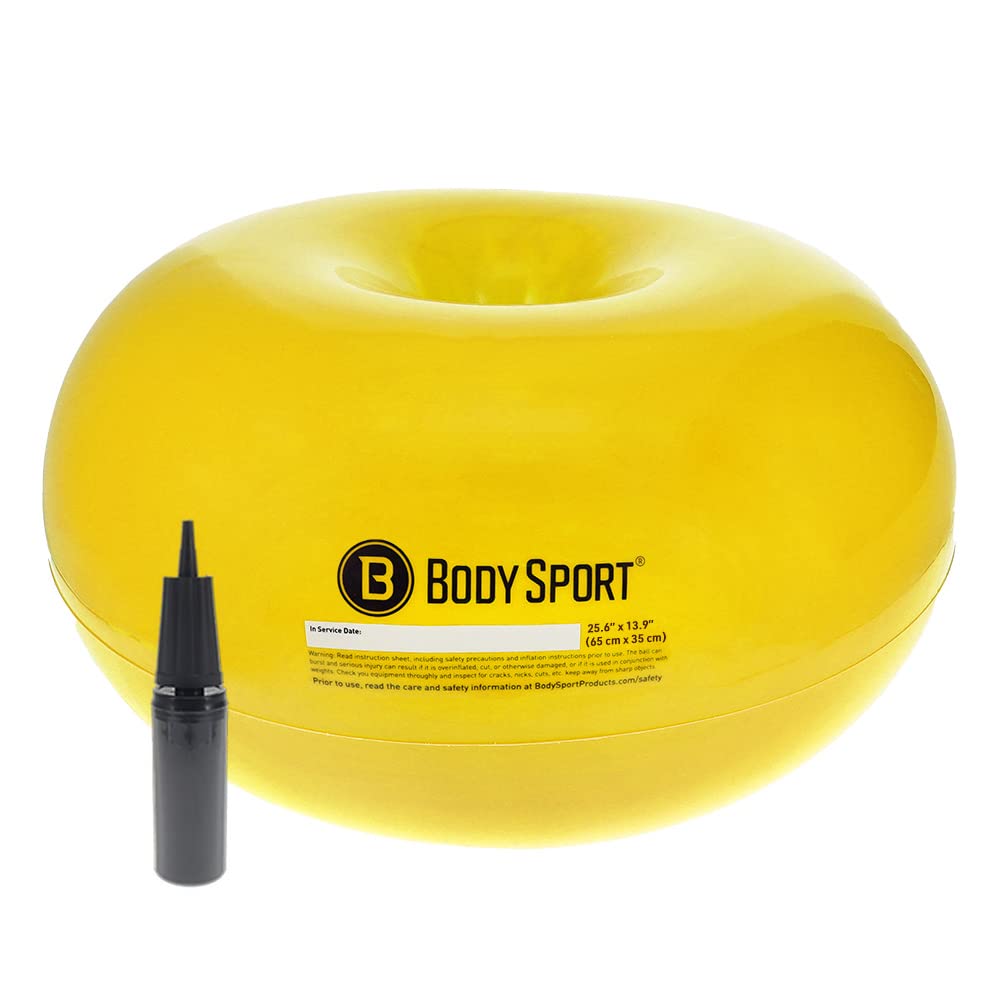 DONUT BALL, YELLOW, 26 IN. X 13.8 IN. (65 CM X 35 CM) – DURABLE, INFLATABLE EXERCISE BALL FOR BALANCE & STABILITY TRAINING, YOGA, & PILATES WORKOUTS – FOR CHILDREN & ADULTS – USE IN HOME, OFFICE, GYM, OR CLASSROOM The BodySport Donut Ball is a dynamic, versatile exercise ball that may help improve flexibility and coordination, train balance and posture, and engage core muscles! Made with high-quality PVC material, this resilient, inflatable ball is designed to withstand repeated use while in class, during training, and at home. This fitness ball features a rounded and flat side, separating it from traditional stability balls. The flat side allows the ball to rest on the floor for more security during movement. The rounded side acts a regular exercise ball that causes active muscle engagement to stabilize and balance the body. This therapy ball is made with natural rubber latex, making it suitable for those sensitive to latex, and its maximum weight capacity is 400 lb. (136 kg). It also features a subtle textured surface that may help improve grip. Suitable for beginners to experienced professionals, this training ball is available in five color-coded sizes with diameters from 17.7 in. (45 cm) to 33.5 in. (85 cm), designed to both children and adults. with the ball are two plugs, one plug remover, and an easy-to-use pump to inflate the ball. Use this donut ball anywhere for stability, toning, balance, flexibility, vestibular movement, and core training with workout routines including yoga, Pilates, and strength training. Plus, it is an ideal classroom companion for kids who would benefit from active stimulation to help focus on tasks, release energy, enhance engagement, and more.