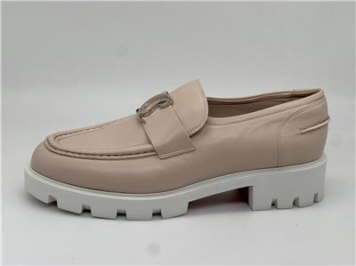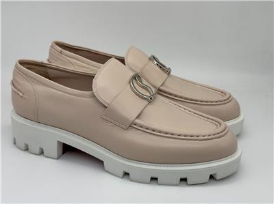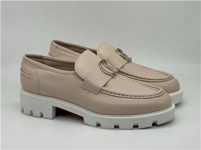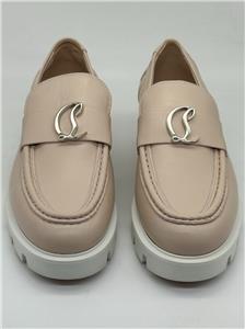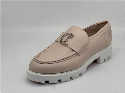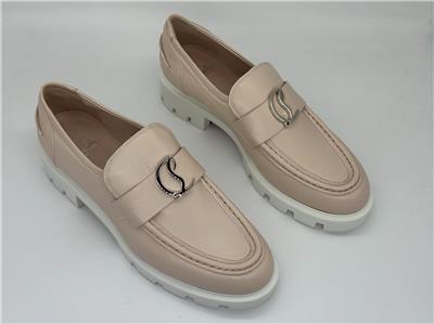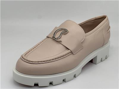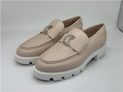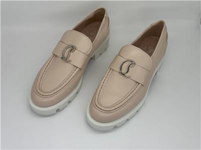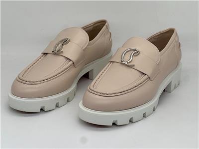 CL-monogram hardware at the strap adds a bit of extra shine to soft leather loafer bumped up on a lug sole with a logo-scrawled red bottom.