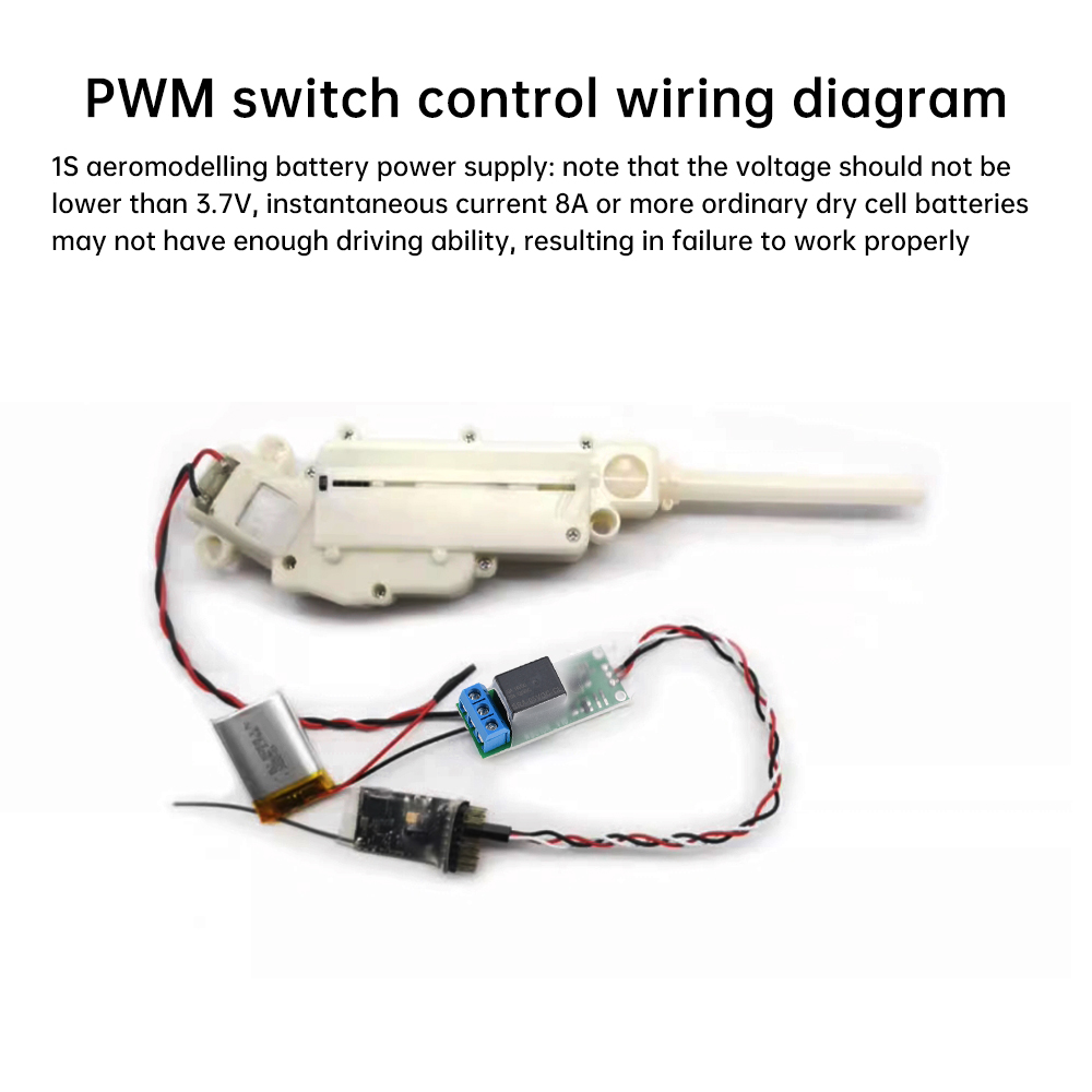 1.Connection Plug the signal input cable into an idle receiver channel that corresponds to one of the switches on the remote control. When connected to the receiver, the power indicator will be lit. The working indicator lights up when the switch channel is open and the opposite is closed.