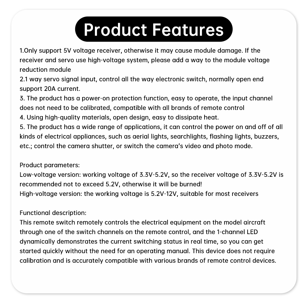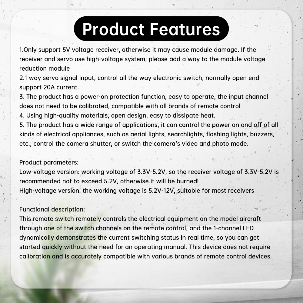 This remote switch remotely controls the electrical equipment on the model airplane through one of the switch channels on the remote control, and the 1-channel LED dynamically demonstrates the current switch status in real time, so you can get started quickly without the need for an operation manual. This device does not require calibration and is accurately compatible with various brands of remote control devices.