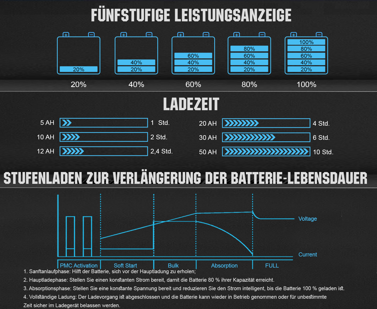 10. Lagerungsverbote: Lassen Sie den Akku nicht über einen längeren Zeitraum in einem zu 100 % geladenen Zustand. Belassen Sie den Akku nicht über längere Zeit in einem Defizitzustand (unter 5 % Leistung).