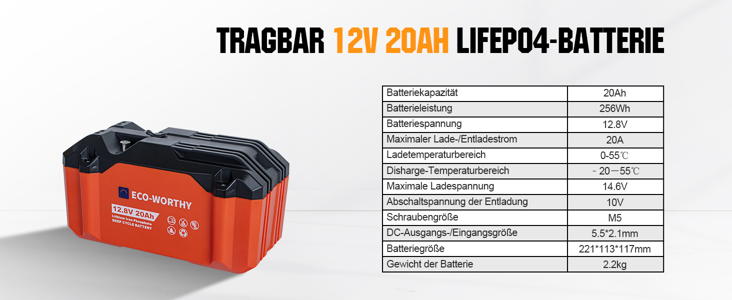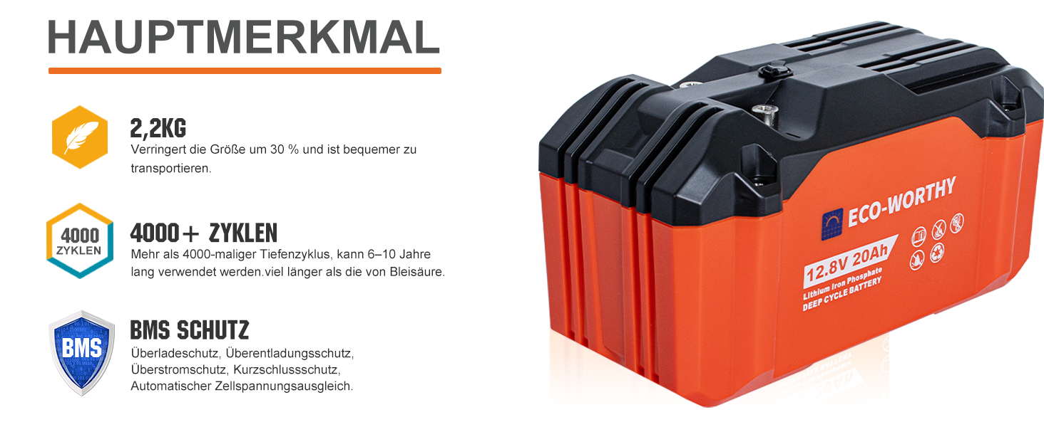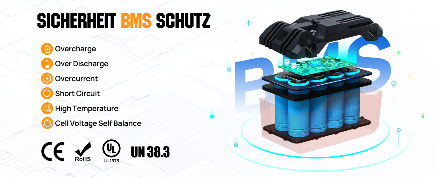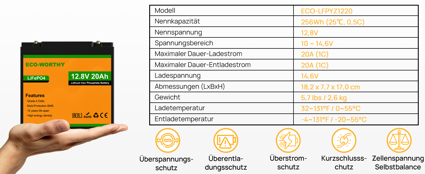 ECO-WORTHY-Batterie verfügt über ein integriertes BMS (Batterie managemen tsystem), geringe Selbstentladung, kann Überladung, Tiefentladung, Überstrom, Überlastung, Kurzschluss verhindern.