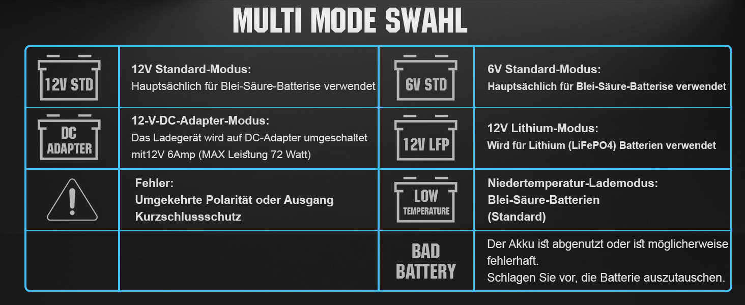 A: Sie können ein Wechselstrom-zu-Gleichstrom-Blei-Säure-Ladegerät verwenden, das über das Stromnetz betrieben wird, da die Ladeeffizienz und -dauer weniger von Bedeutung sind, es darf keine automatischen Desulfatierungs- oder Ausgleichsmodi haben. Wenn dies der Fall ist, verwenden Sie es nicht, da die Gefahr einer Beschädigung der Zellen oder des Akkus besteht. Dies kann die Lebensdauer der Batterie erheblich verkürzen. Wenn es ein einfaches Massen- / Absorptions- / Erhaltungsladeprofil hat, kann es zum Aufladen der Batterie verwendet werden, muss jedoch nach dem Laden getrennt werden und darf nicht im Erhaltungslade-/Wartungsmodus belassen werden. Es muss auch eine maximale Ausgangsspannung von 13V-14,5V haben.