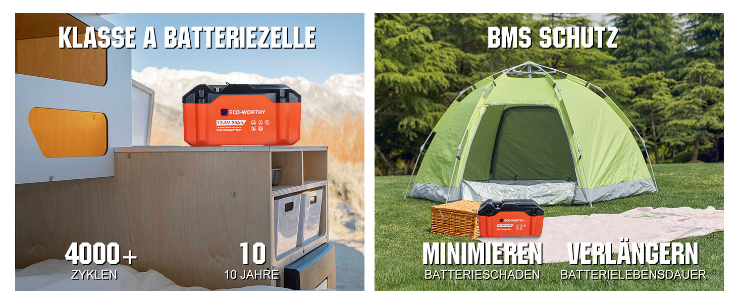 ECO-WORTHY Lithium-Eisenphosphat-Batterie wird mehr als 4000-mal recycelt, was mehr als das Achtfache von Blei-Säure-Batterien (300-400-mal) ist. Die Lebensdauer kann unter idealen Bedingungen 10 Jahre erreichen.