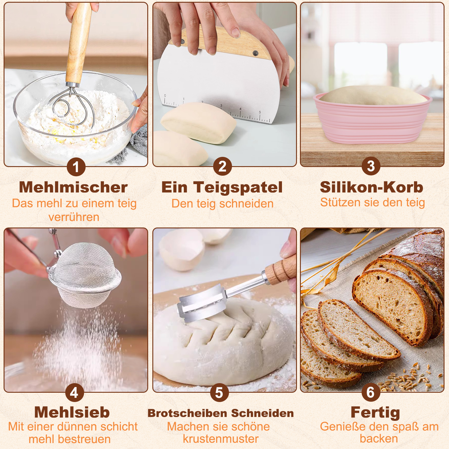 【Ideal für Anfänger und Erfahrene Bäcker】Unsere Brot Backen Zubehör sind ideal für Hausfrauen, Freunde und Backbegeisterte. Perfekt für alle, die sich für das Brotbacken zu Hause interessieren. Kommen Sie und entdecken Sie die Freude an der handwerklichen Brotherstellung mit unserem Kit! Zeigen Sie Ihre Backkünste! Teilen Sie Fotos Ihres Meisterwerks Brot mit Ihren Freunden und verbreiten Sie Freude und Freude an sie.